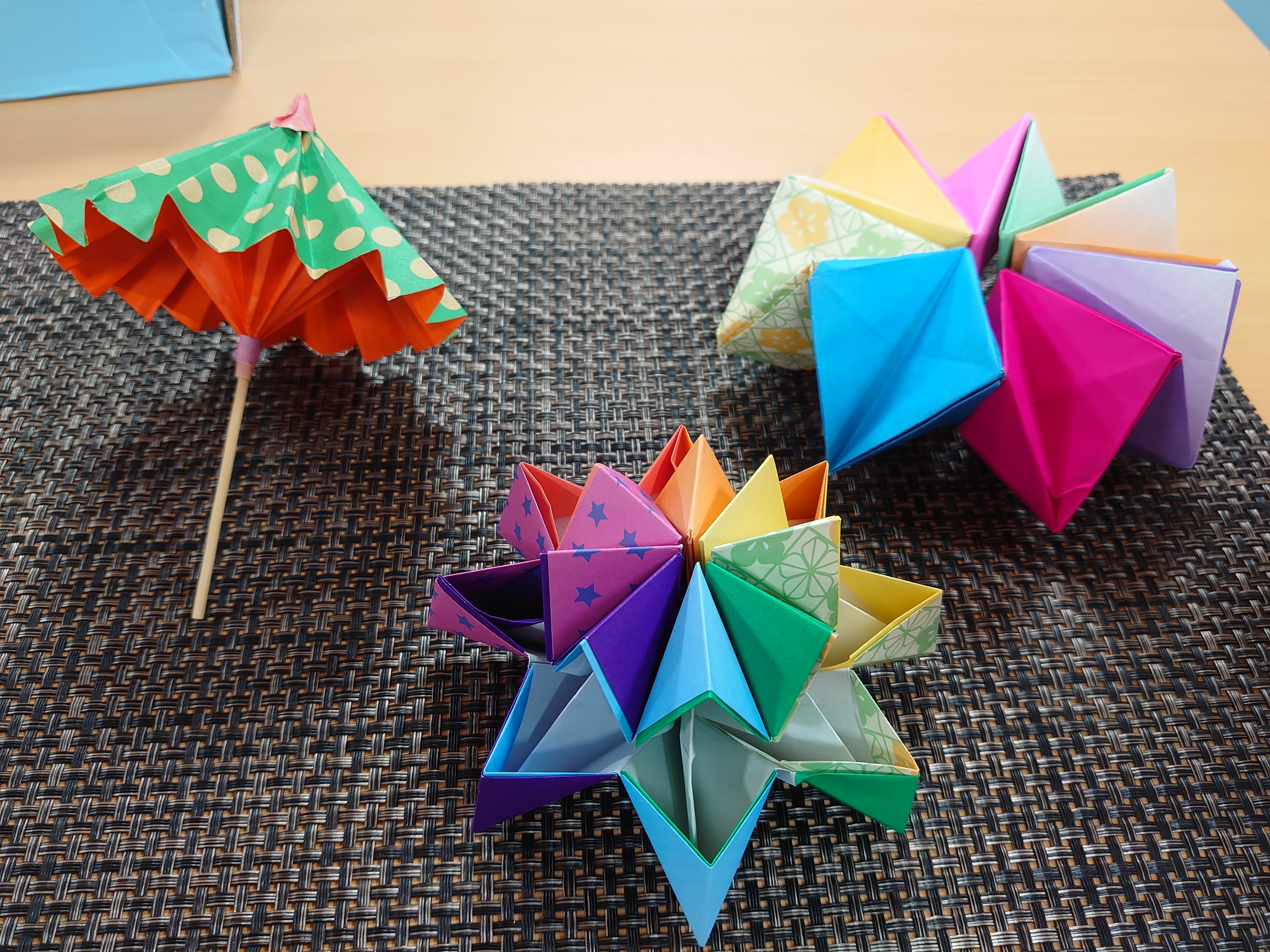 今日は、番傘と万華鏡を折り紙で作りました。
