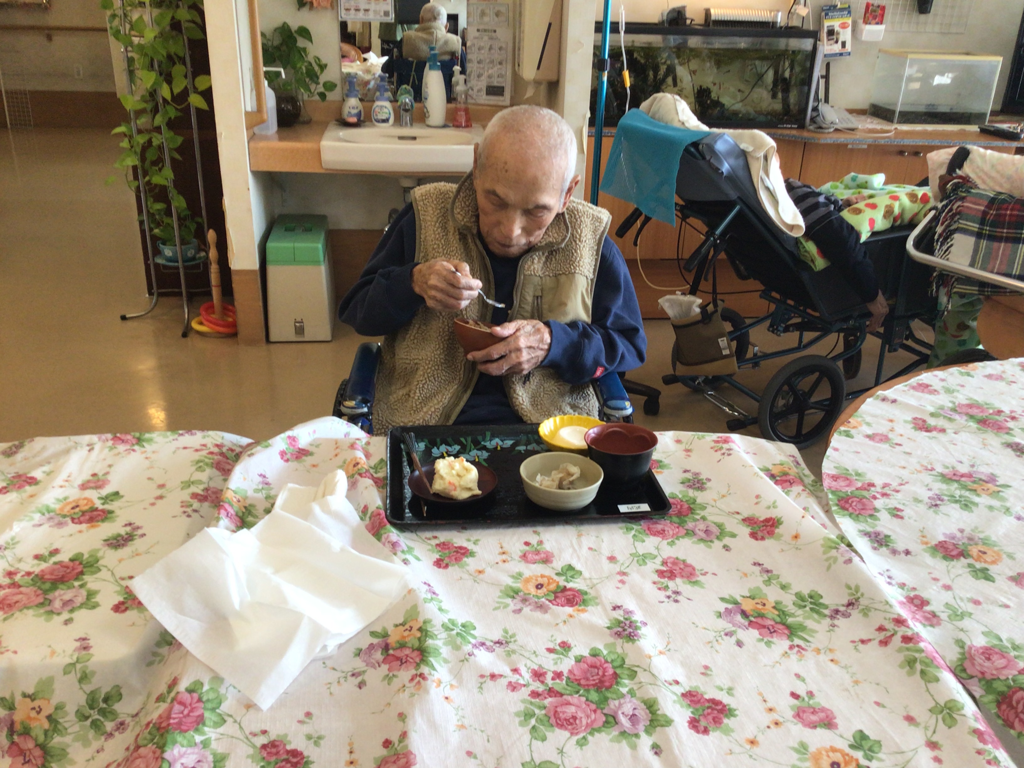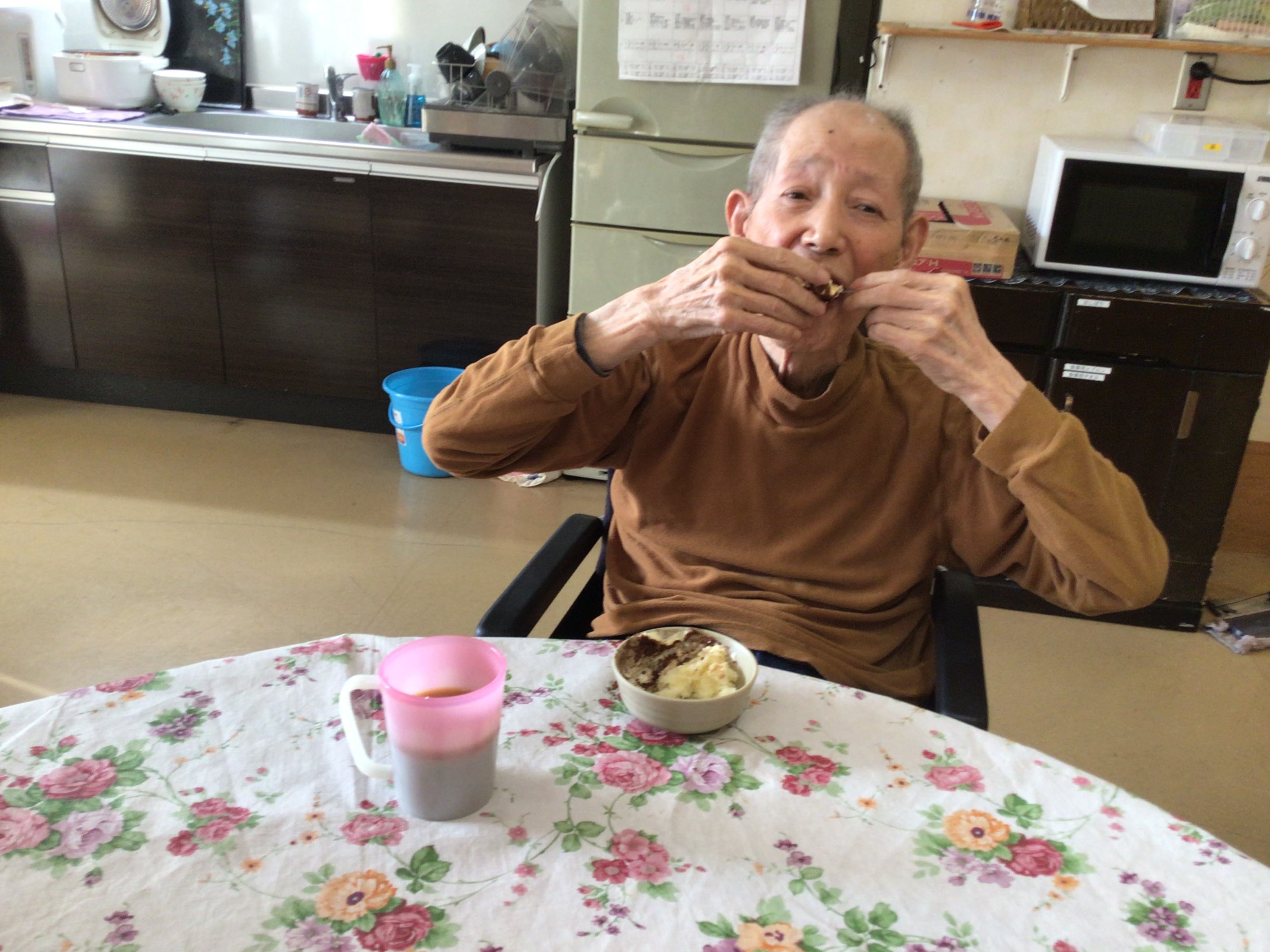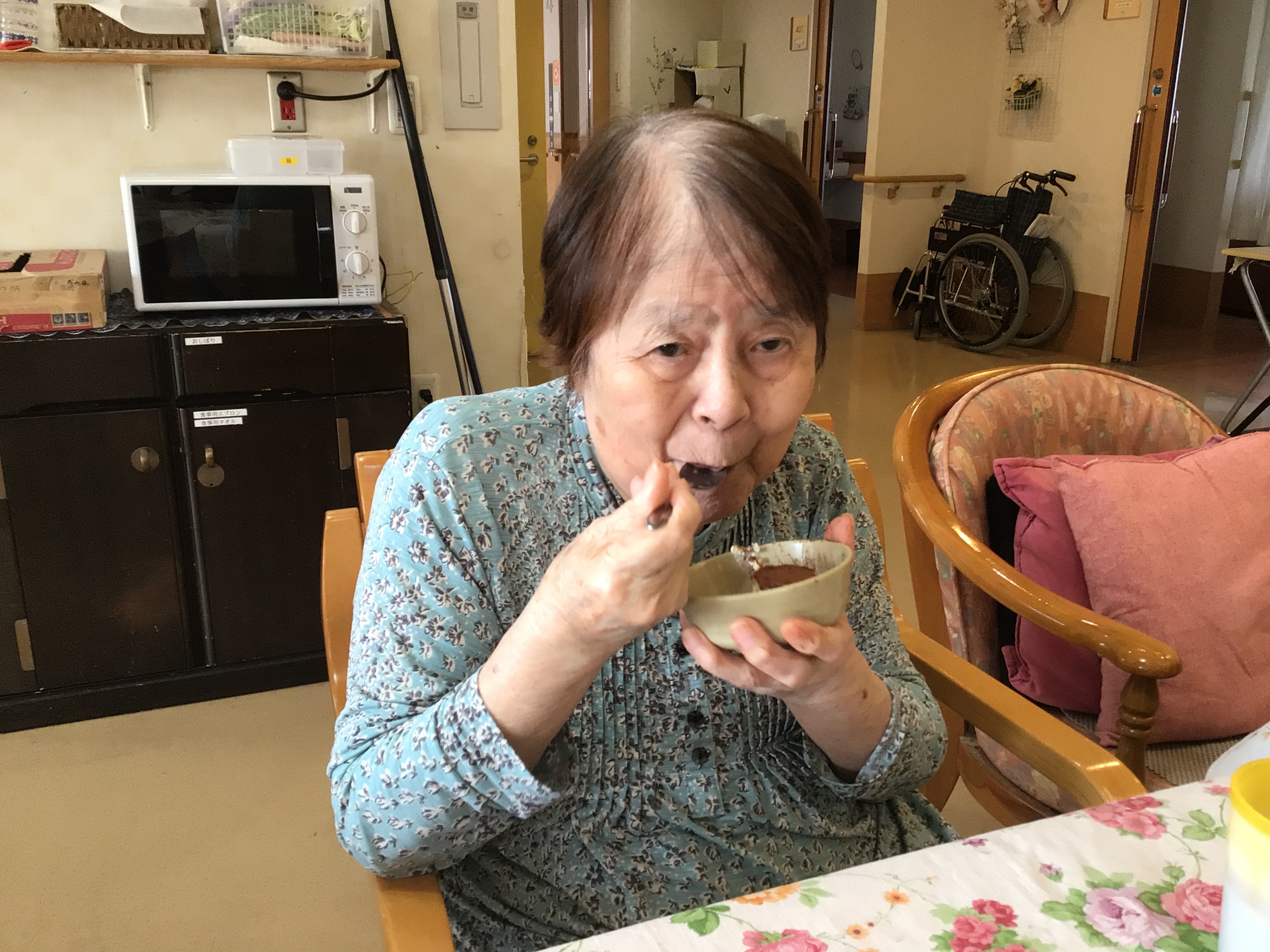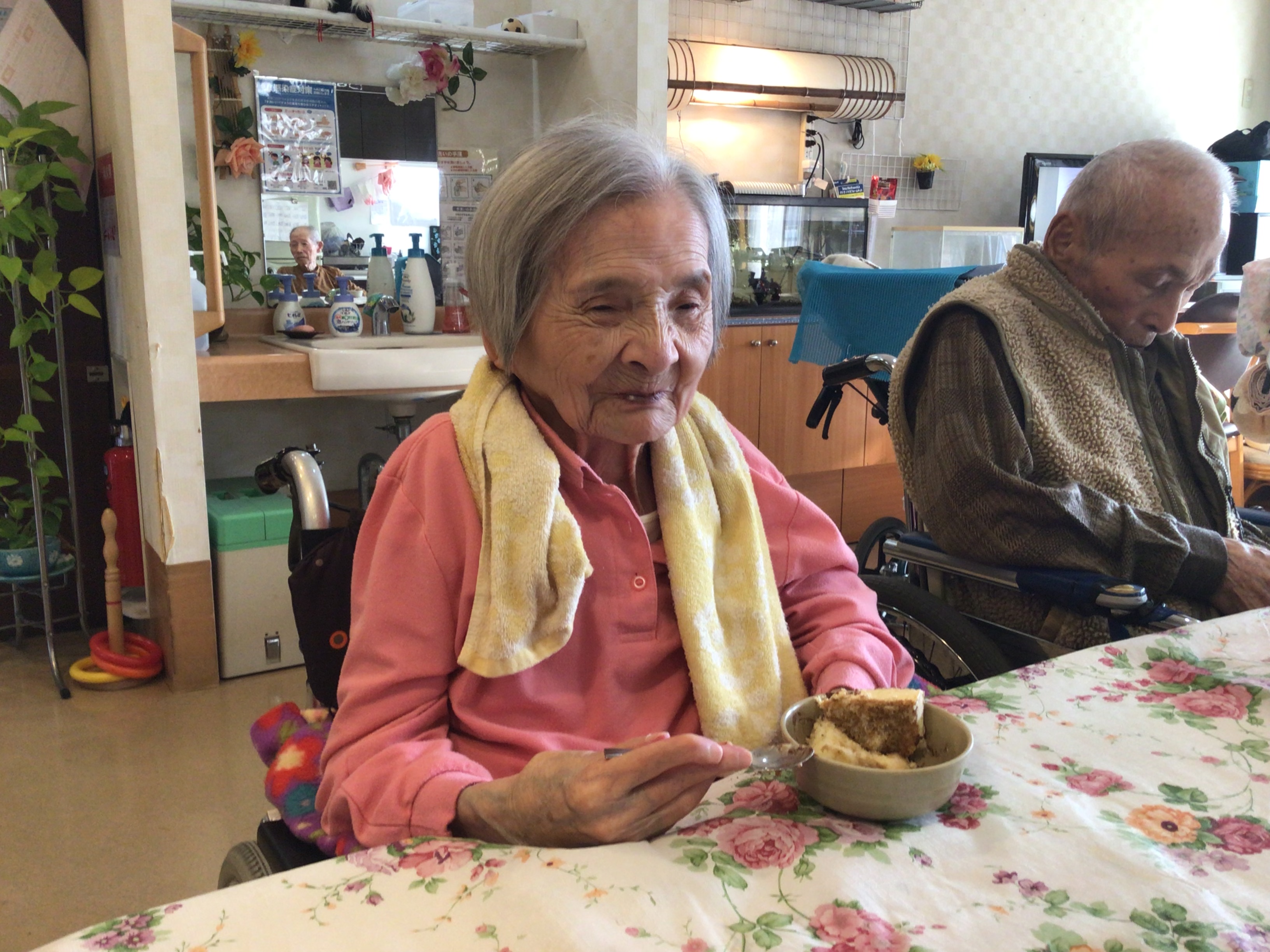 これも中々好評でした。 食べてる姿を写真に収めるのは気が引けるのですが、デザートならありか? と自分に言い聞かせて撮影させて頂きました。 残念な事に、口から食べられない方もおられます。 食べてる所を見て頂くのも、部屋に居て頂くのも寂しいので 雰囲気を味わって頂いたり、音楽をかけたりさせて頂いています。 その後はプレゼントをお渡ししました。