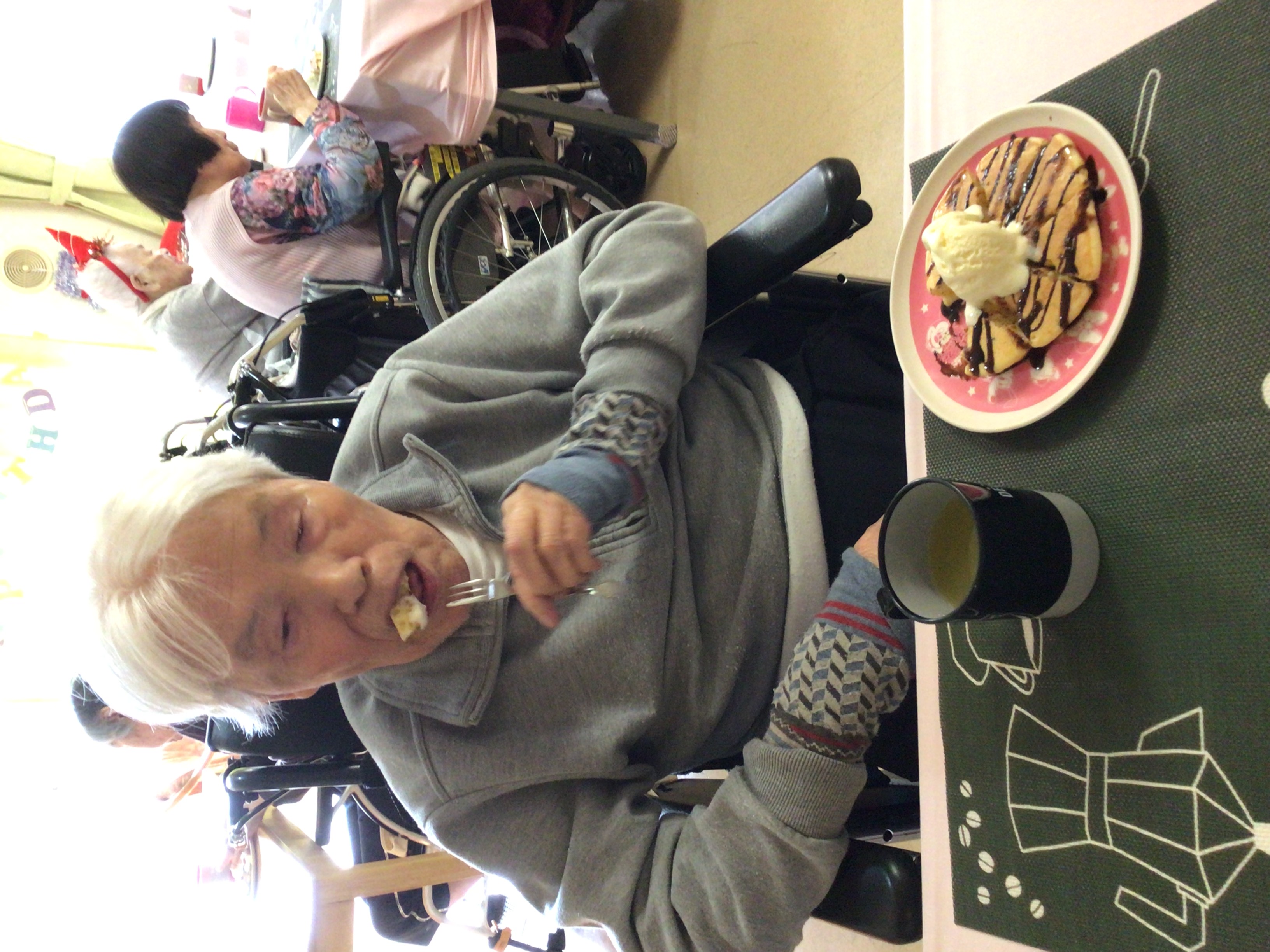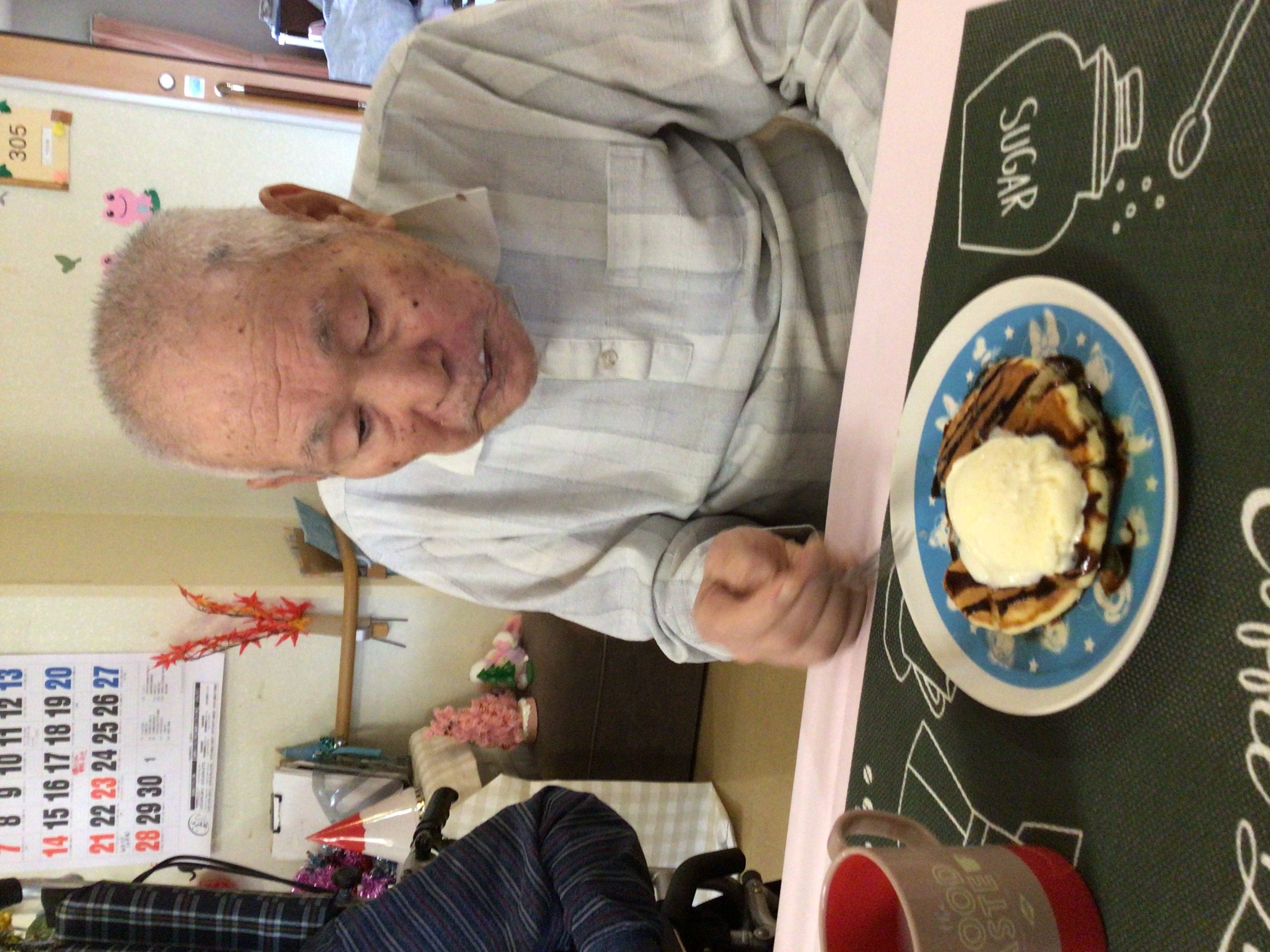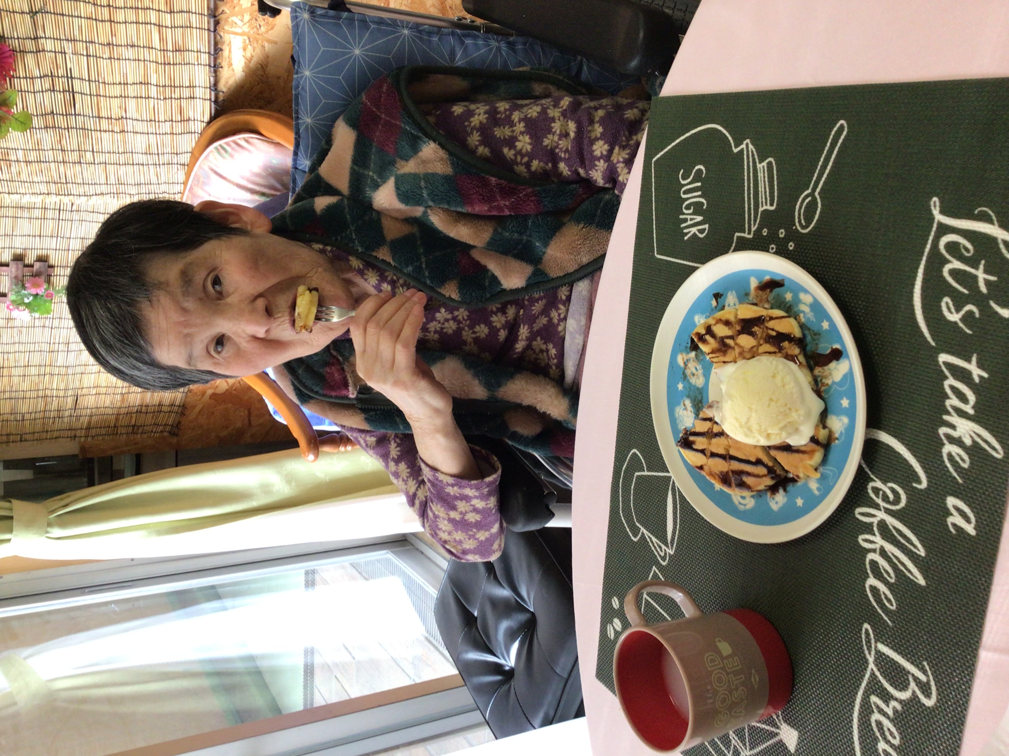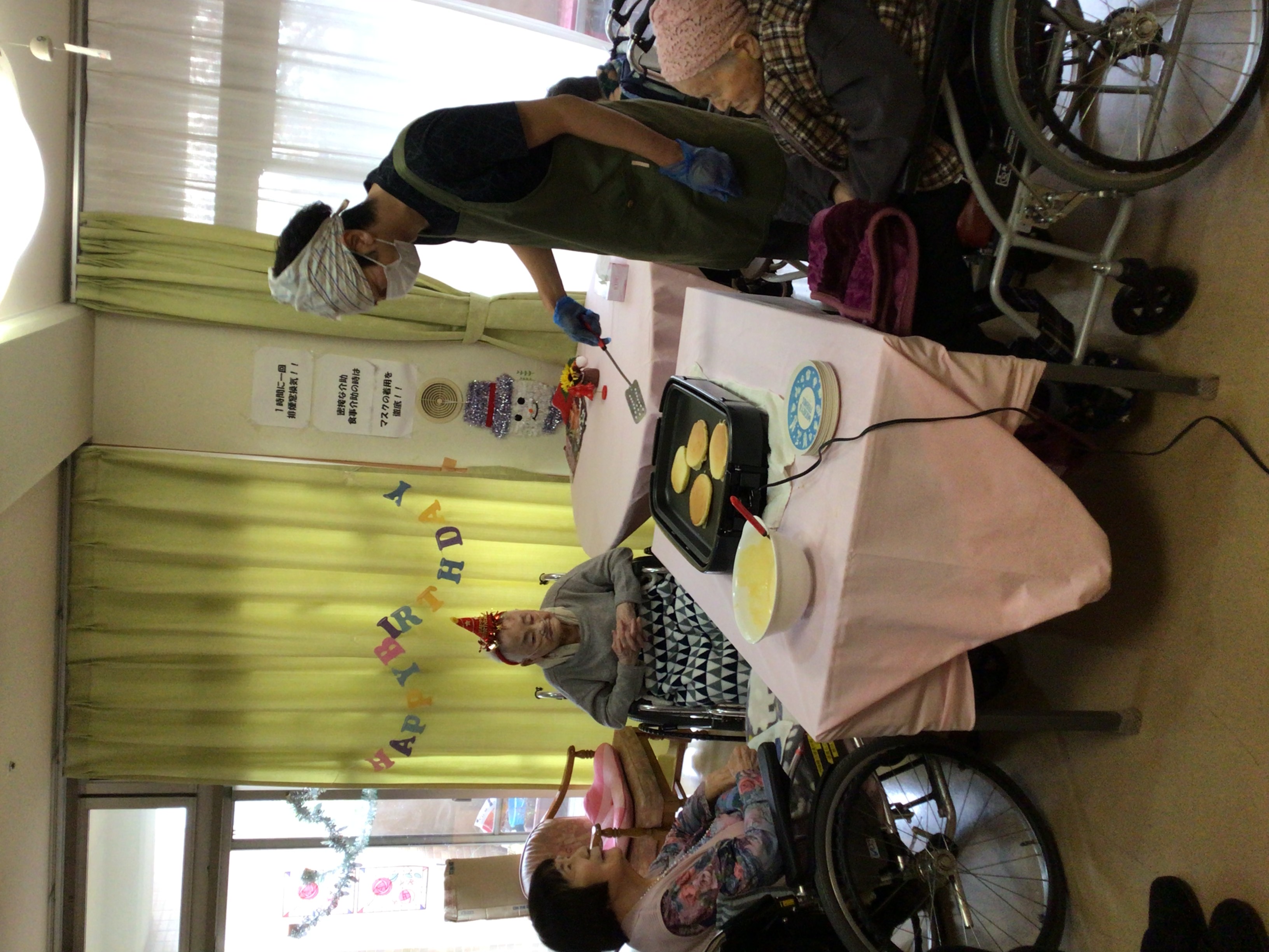 ホットプレートで、ご利用者の前でホットケーキを焼き、興味津々で見て頂きました(笑)