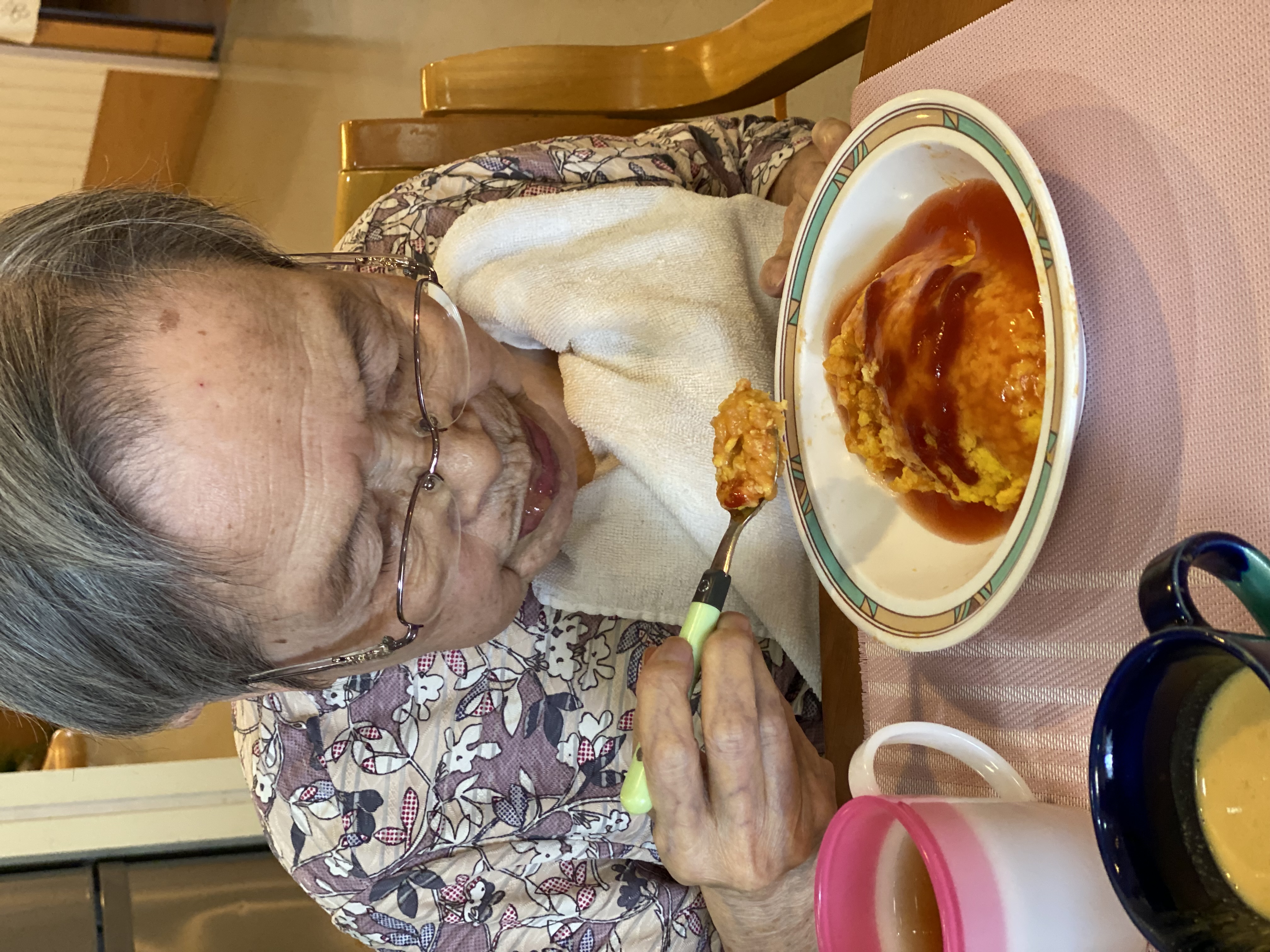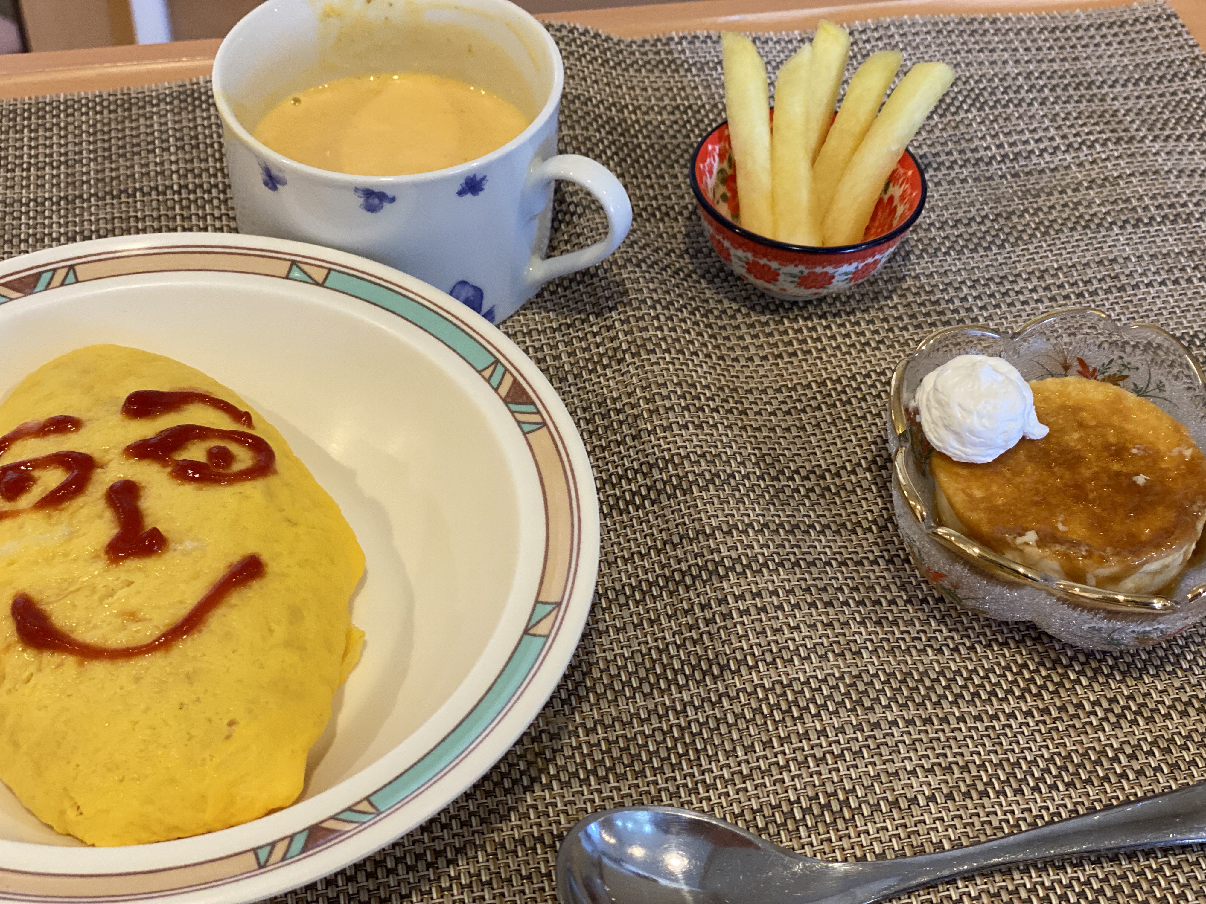 昼食はオムライス、ポタージュ、ポテト、プリンです!!