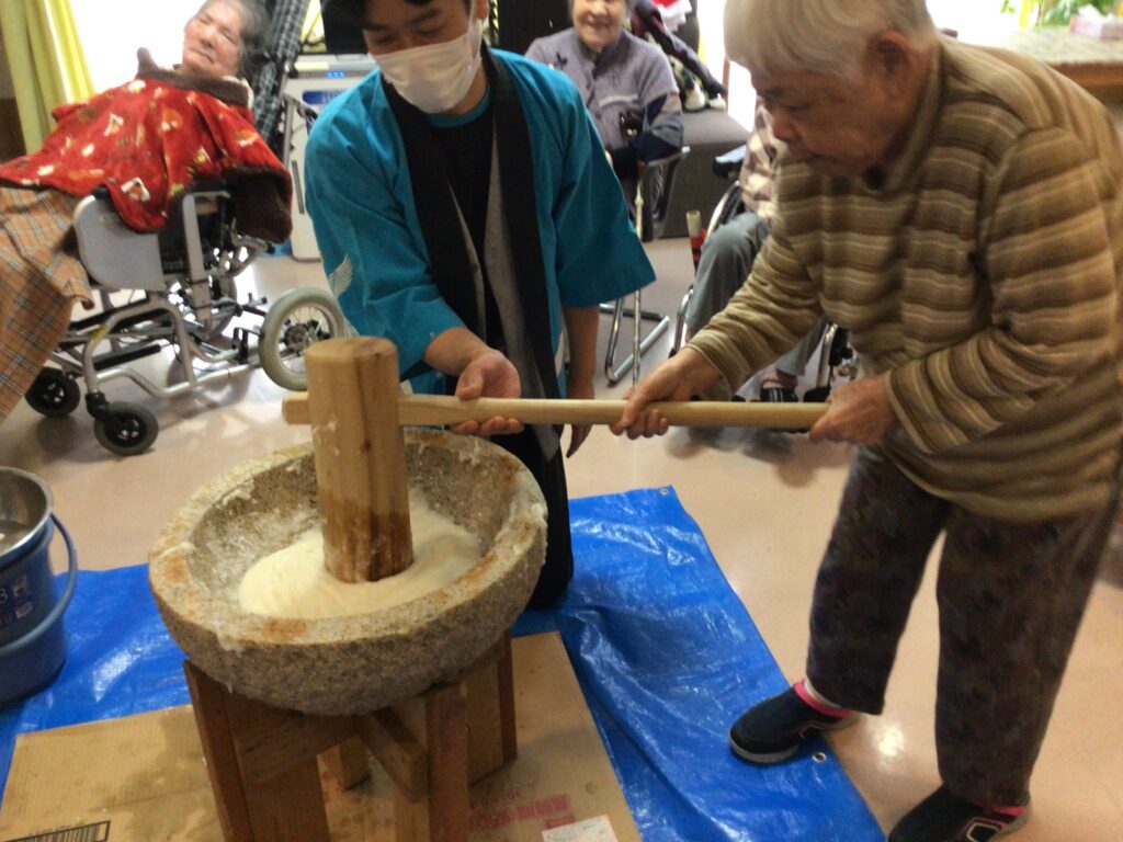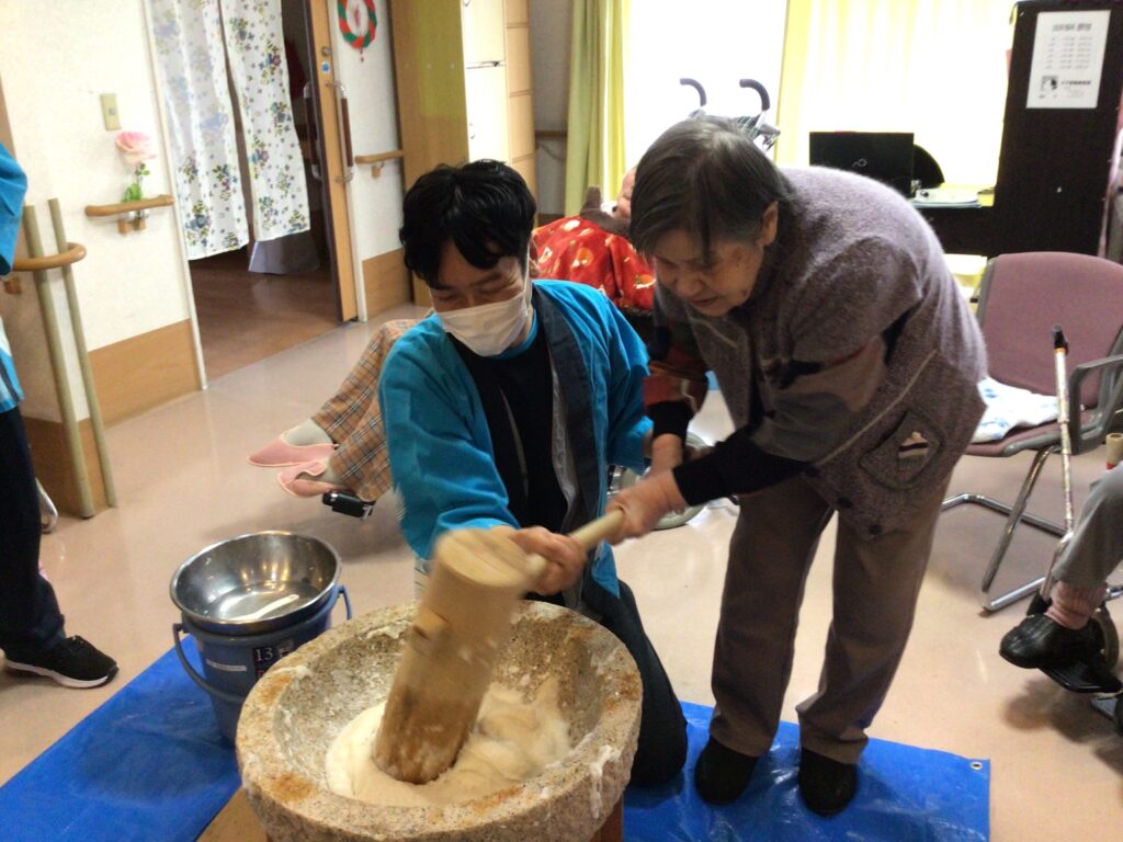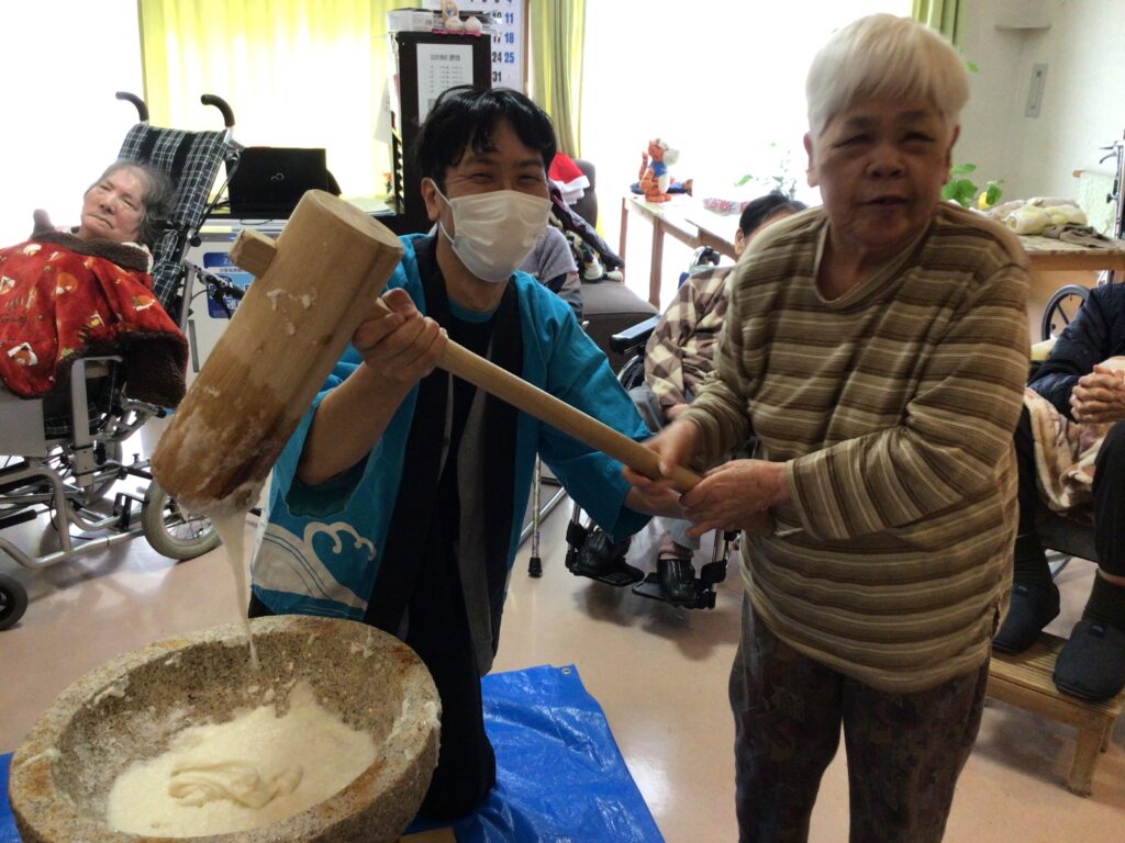 餅つき前には「こんな大きな杵持てるかなぁ」と仰られていた方も、職員と一緒に「よいしょー!」と力強く杵を振り上げられていました!(^^)!