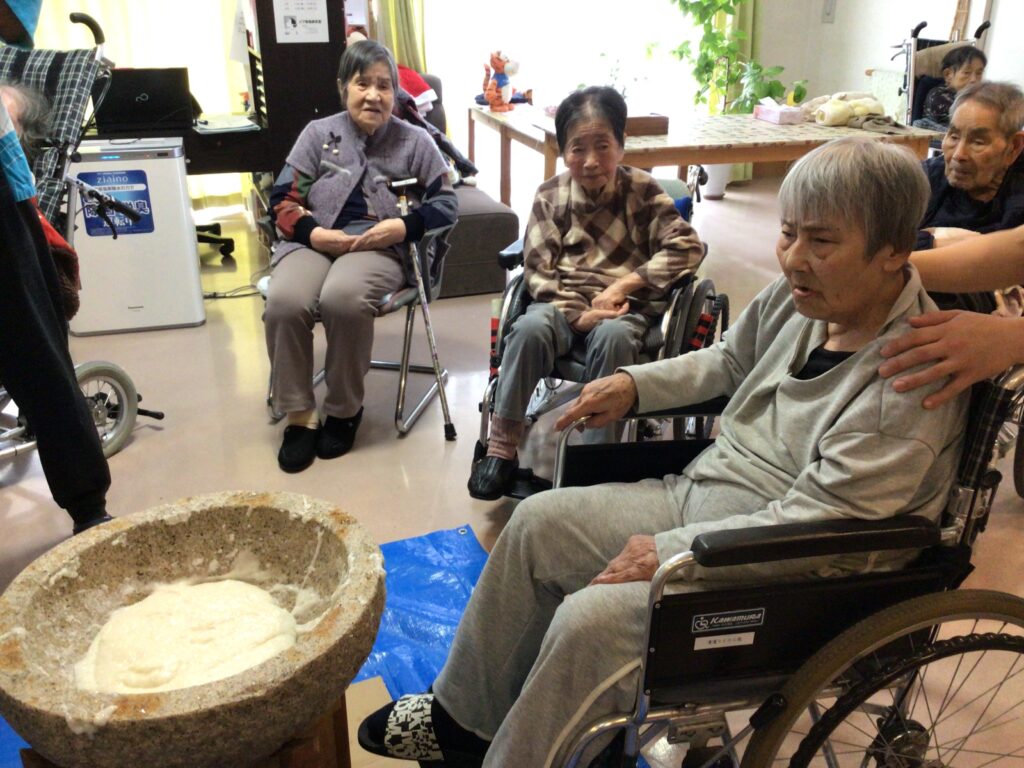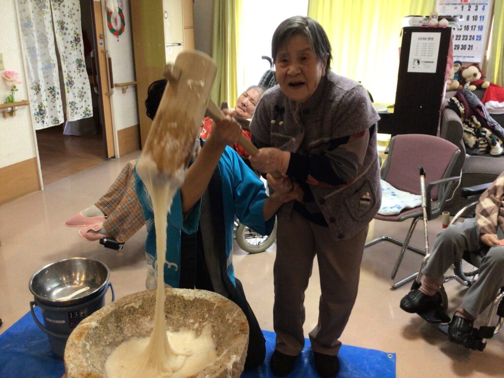 入居者様達もお餅つきを前日から楽しみにされており、行事担当職員が臼と杵をユニットに持って来られた際にはとても喜ばれていました(*^^)v