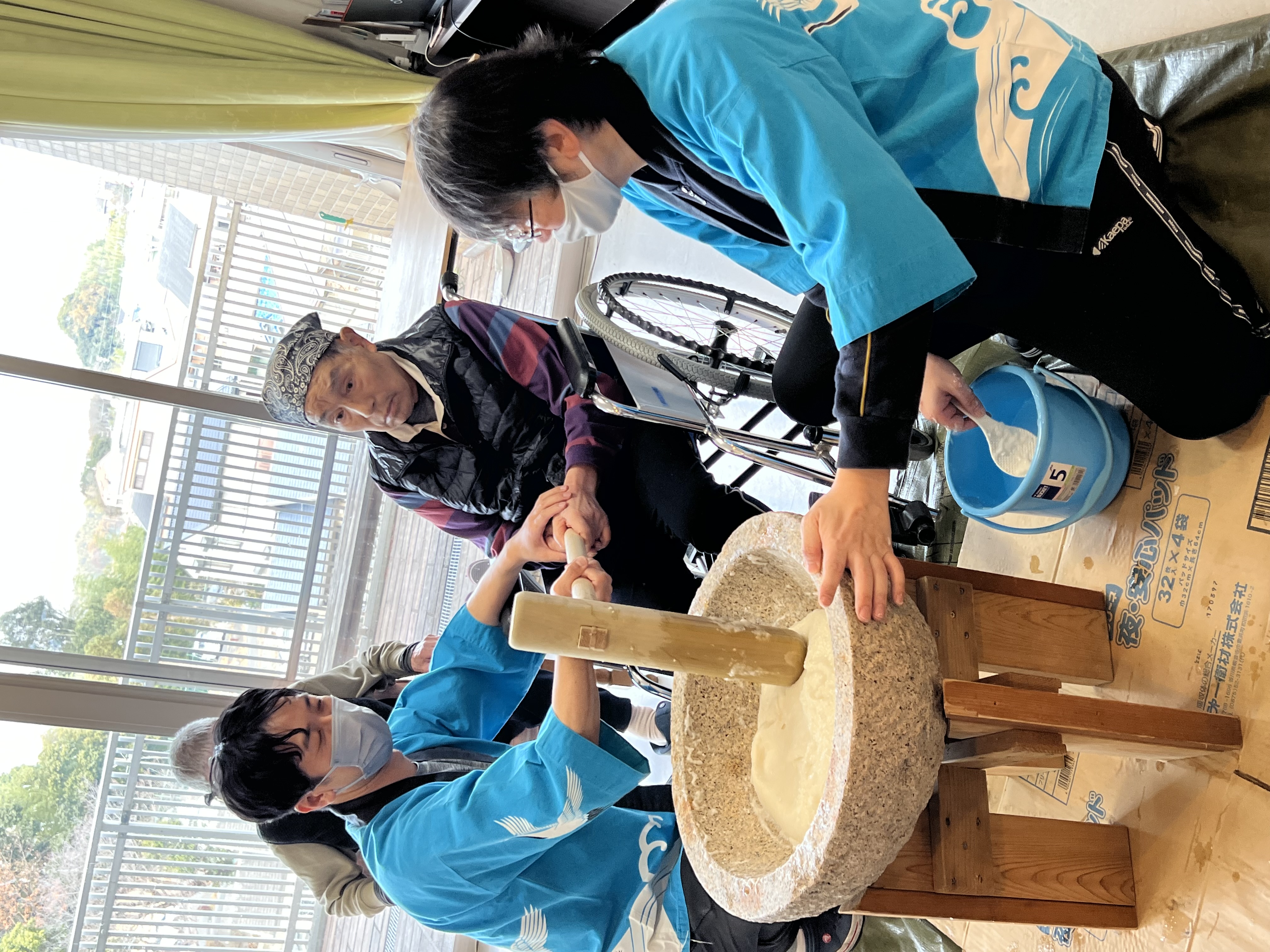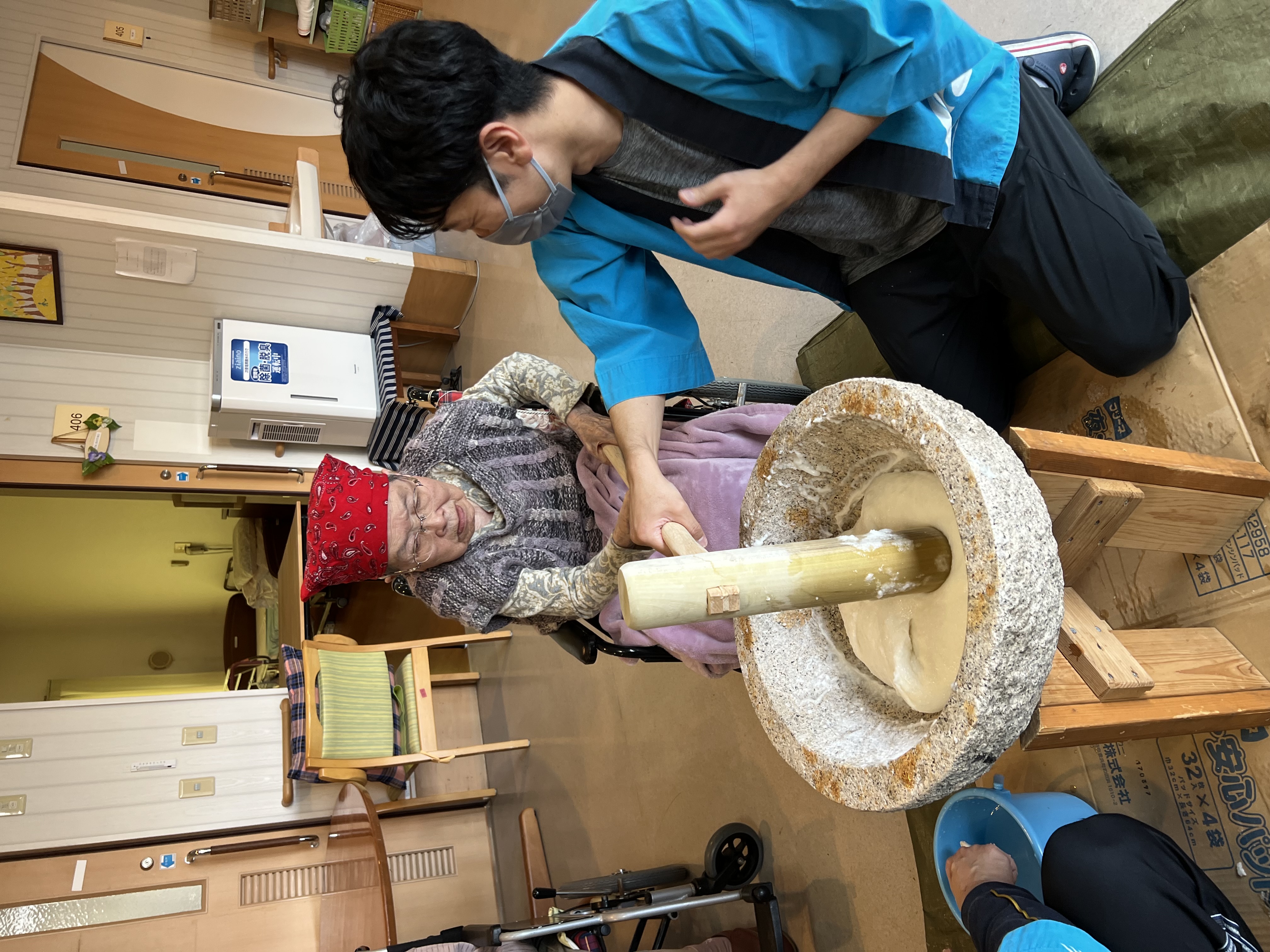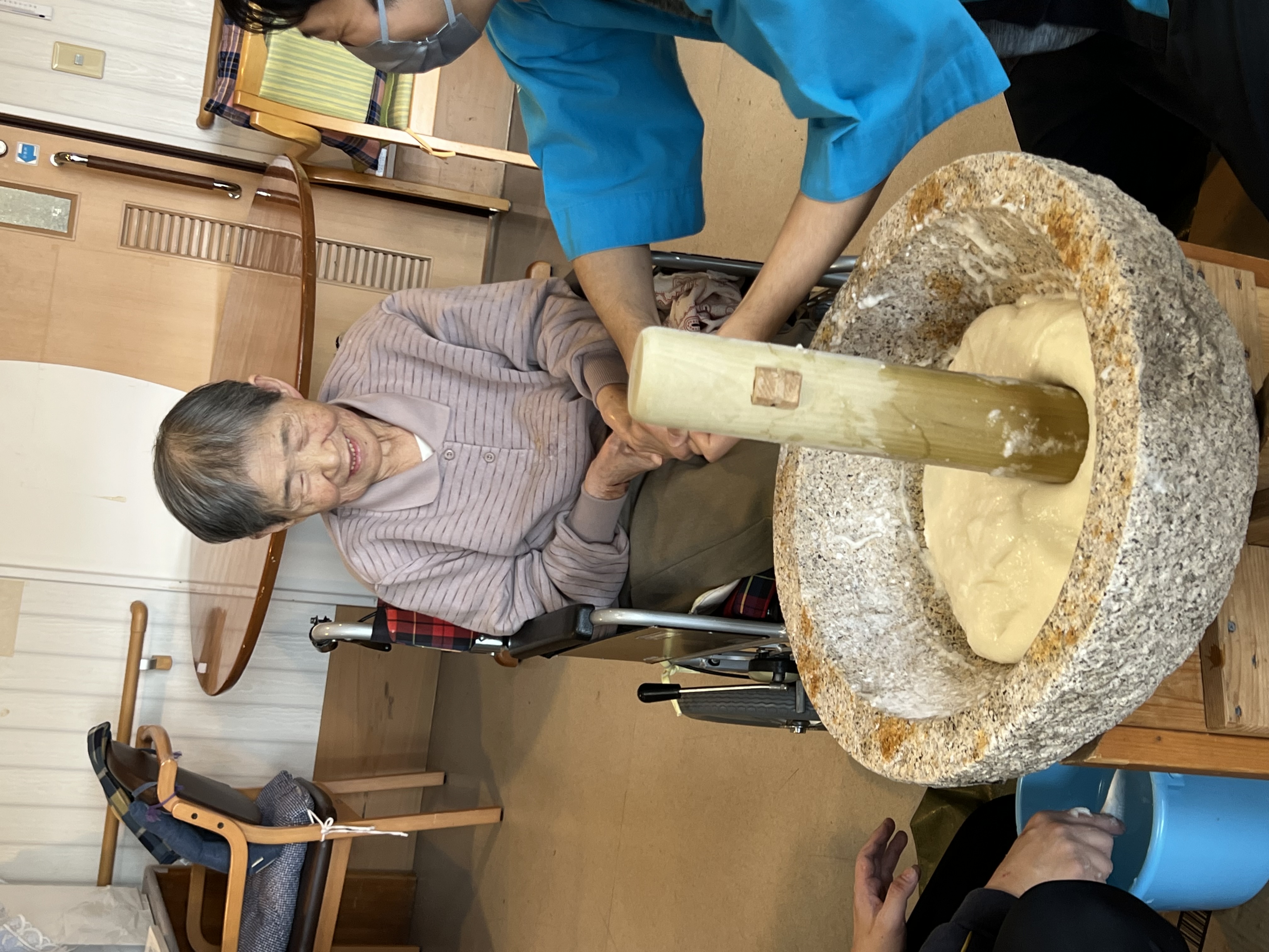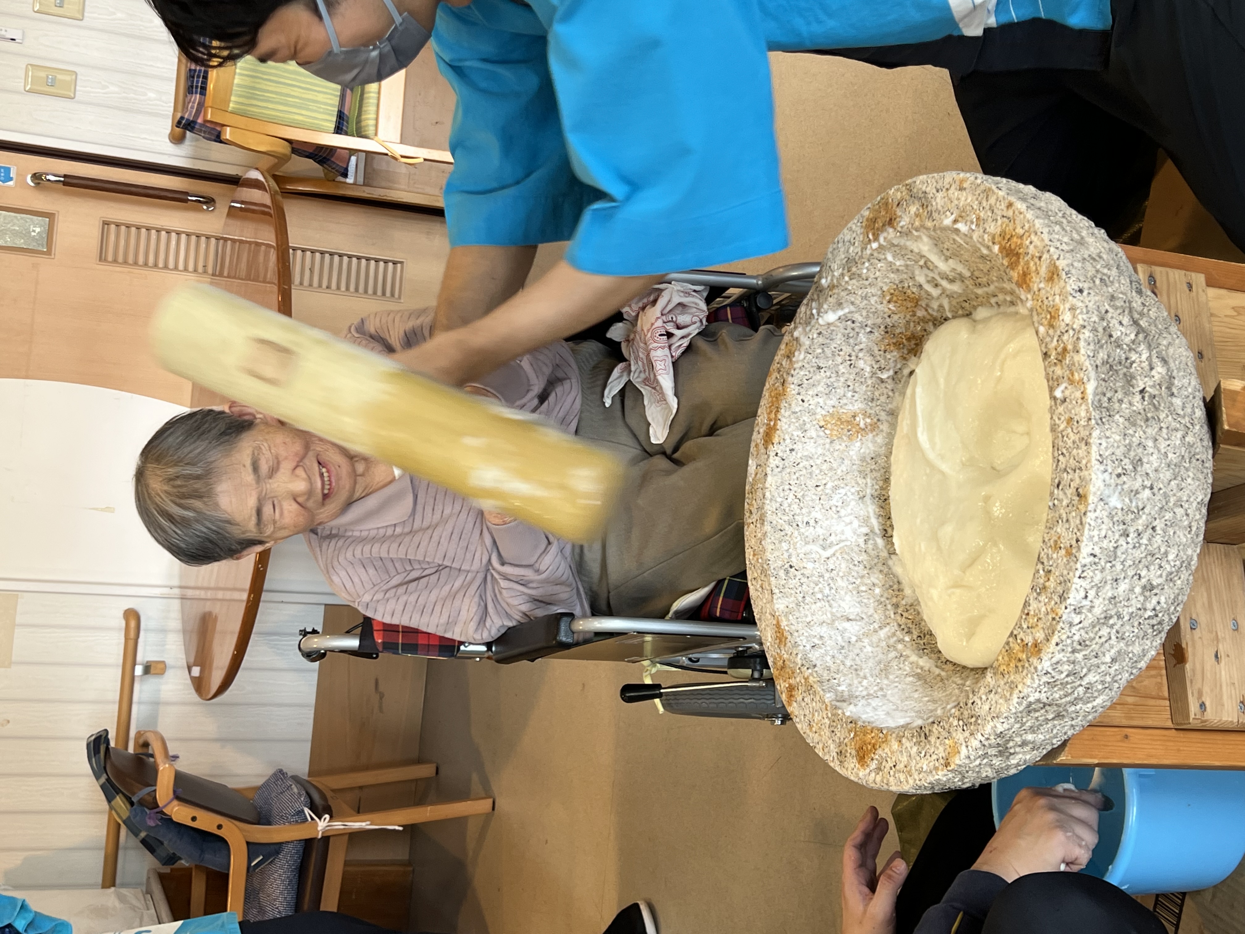 職員のお手伝いなく力強くお餅つをつかれたり、職員と一緒にお餅をついて頂きました😆