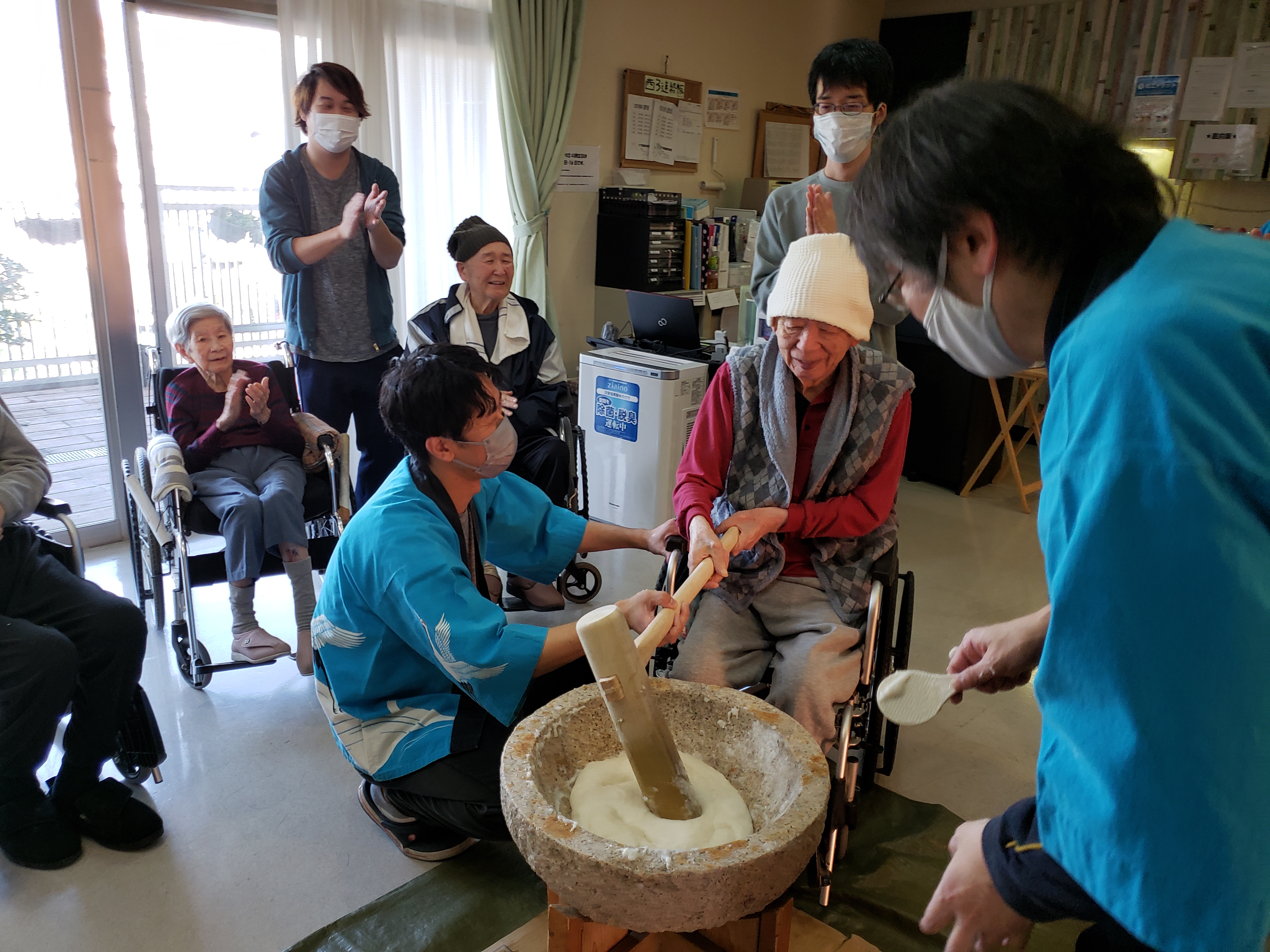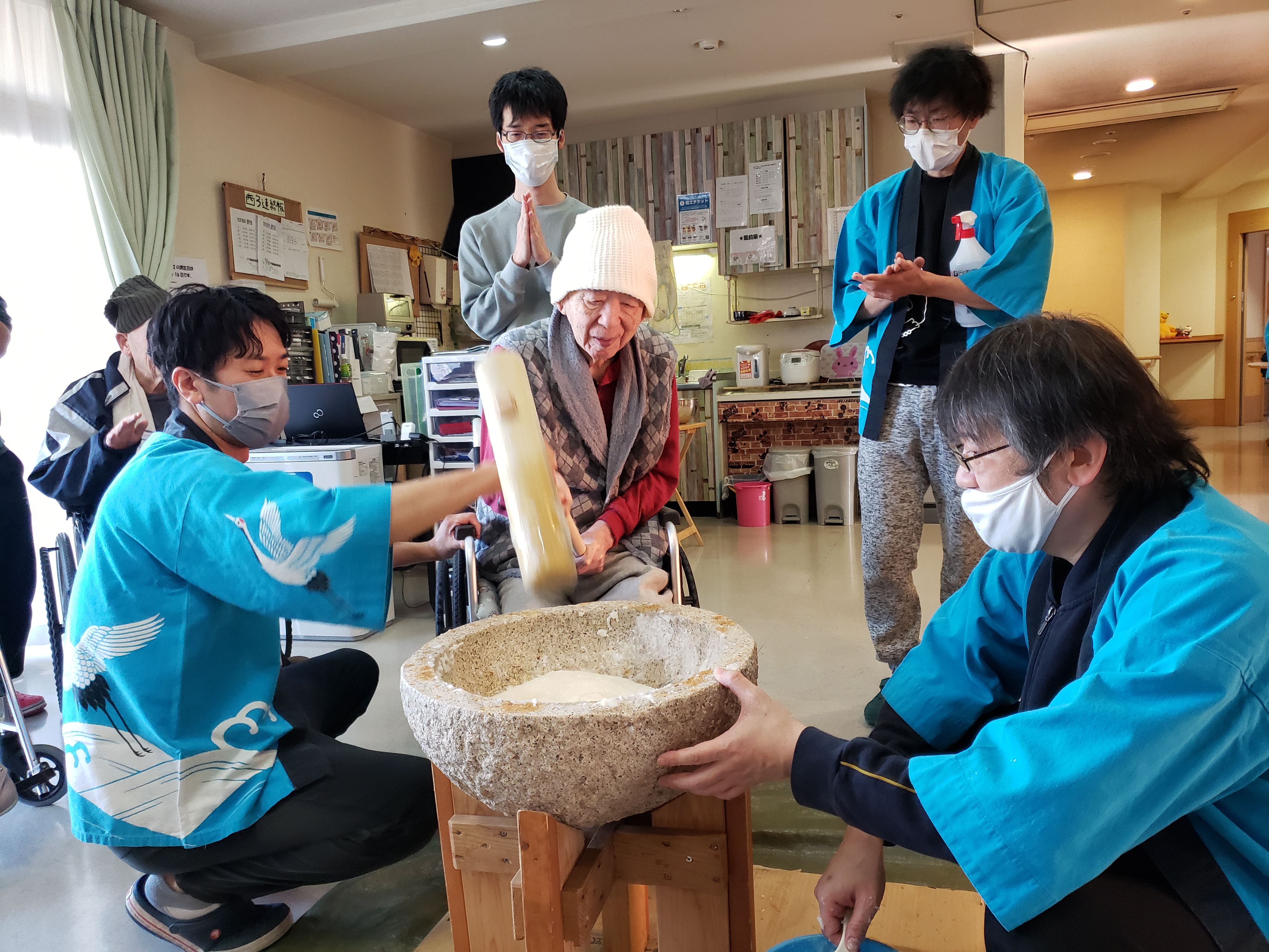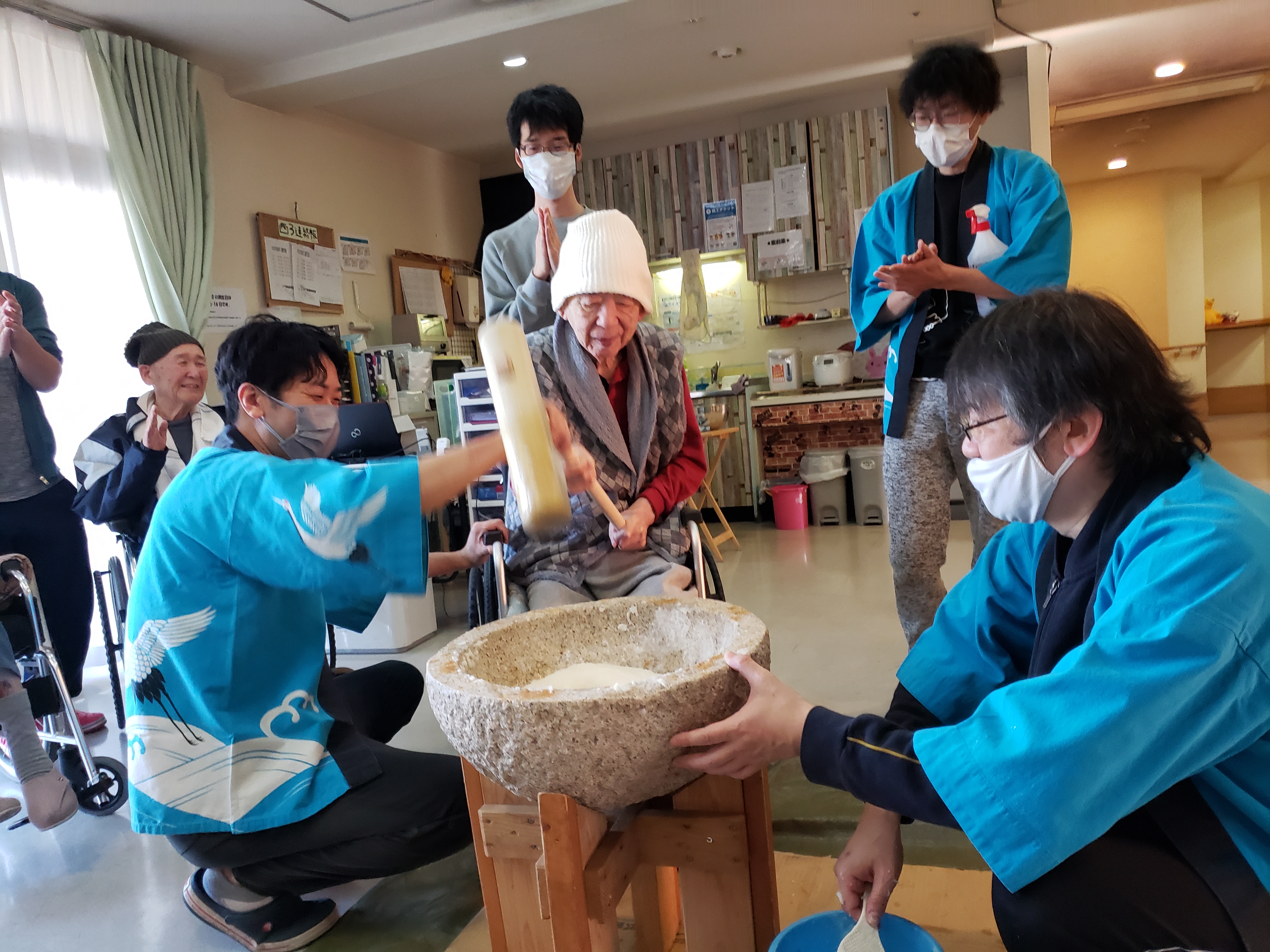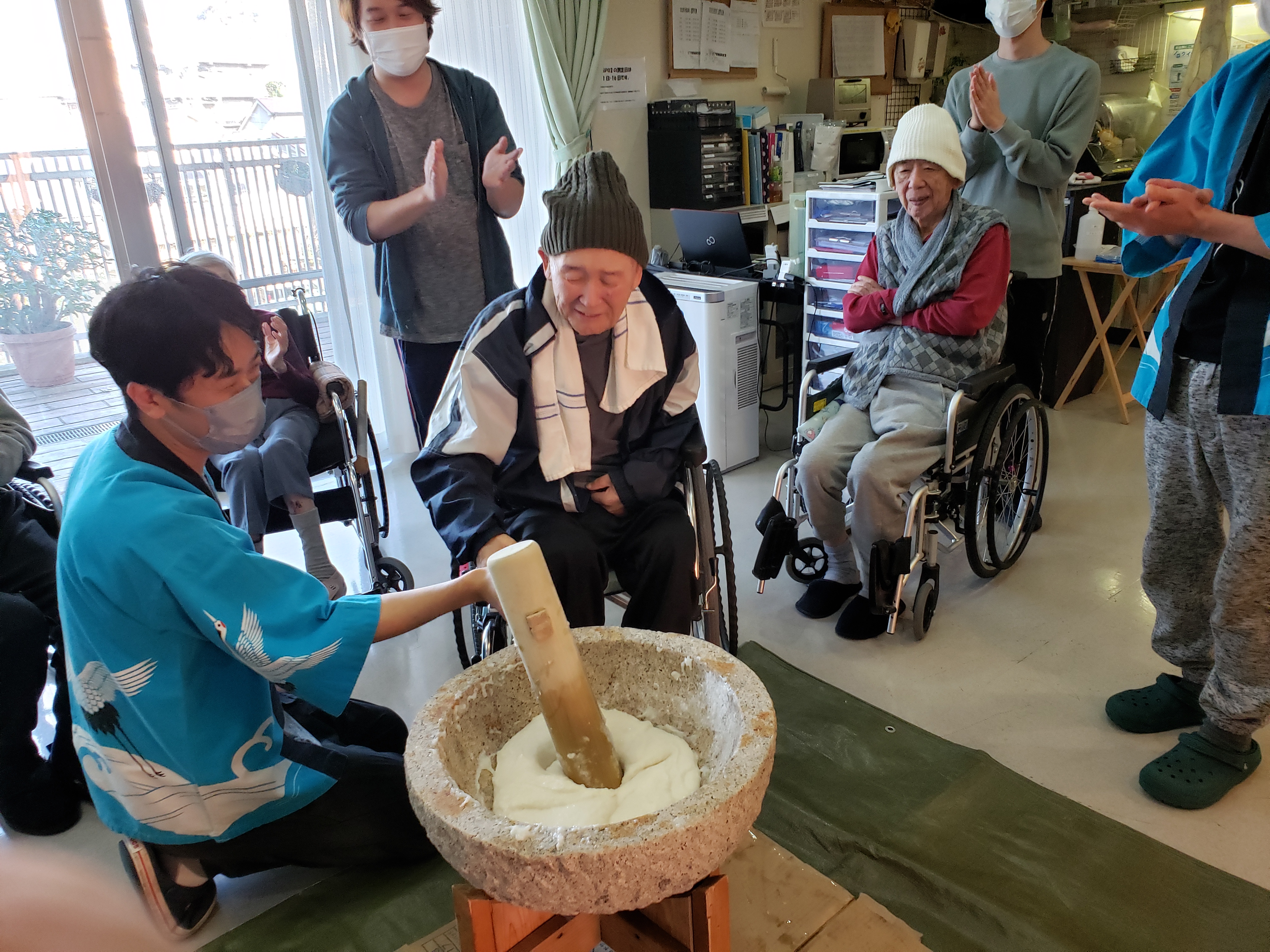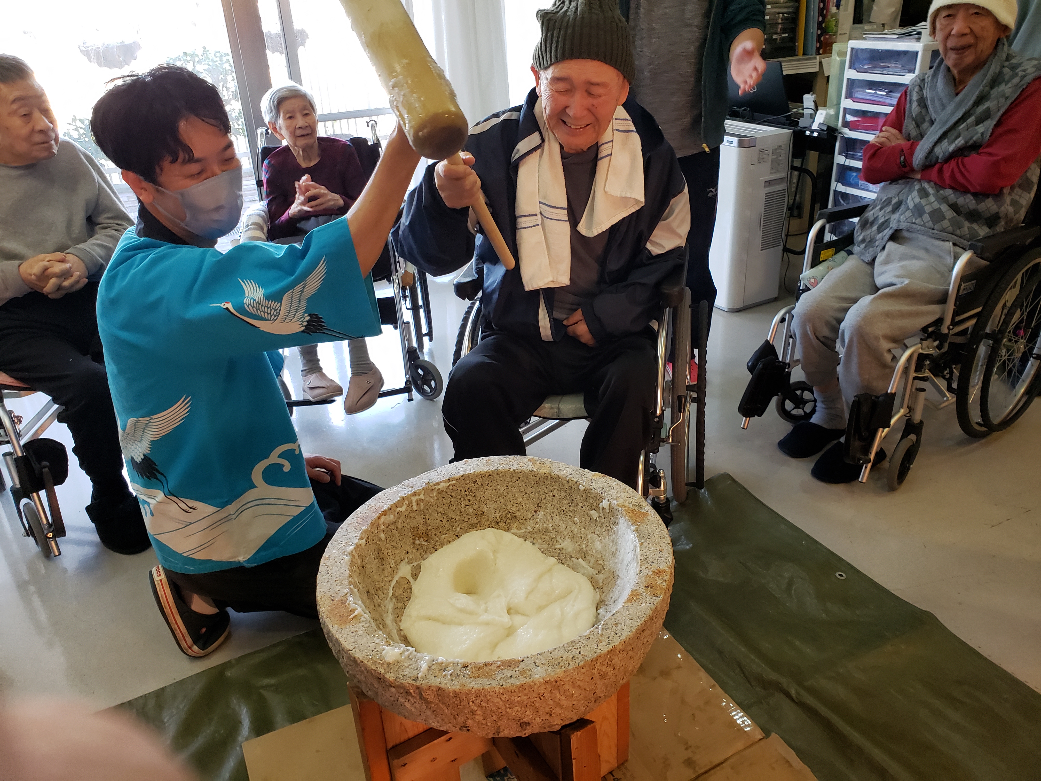 らくらく苑での餅つきは初参加のが利用者もおられましたが、皆様とても楽しく力強くついて下さいました。
