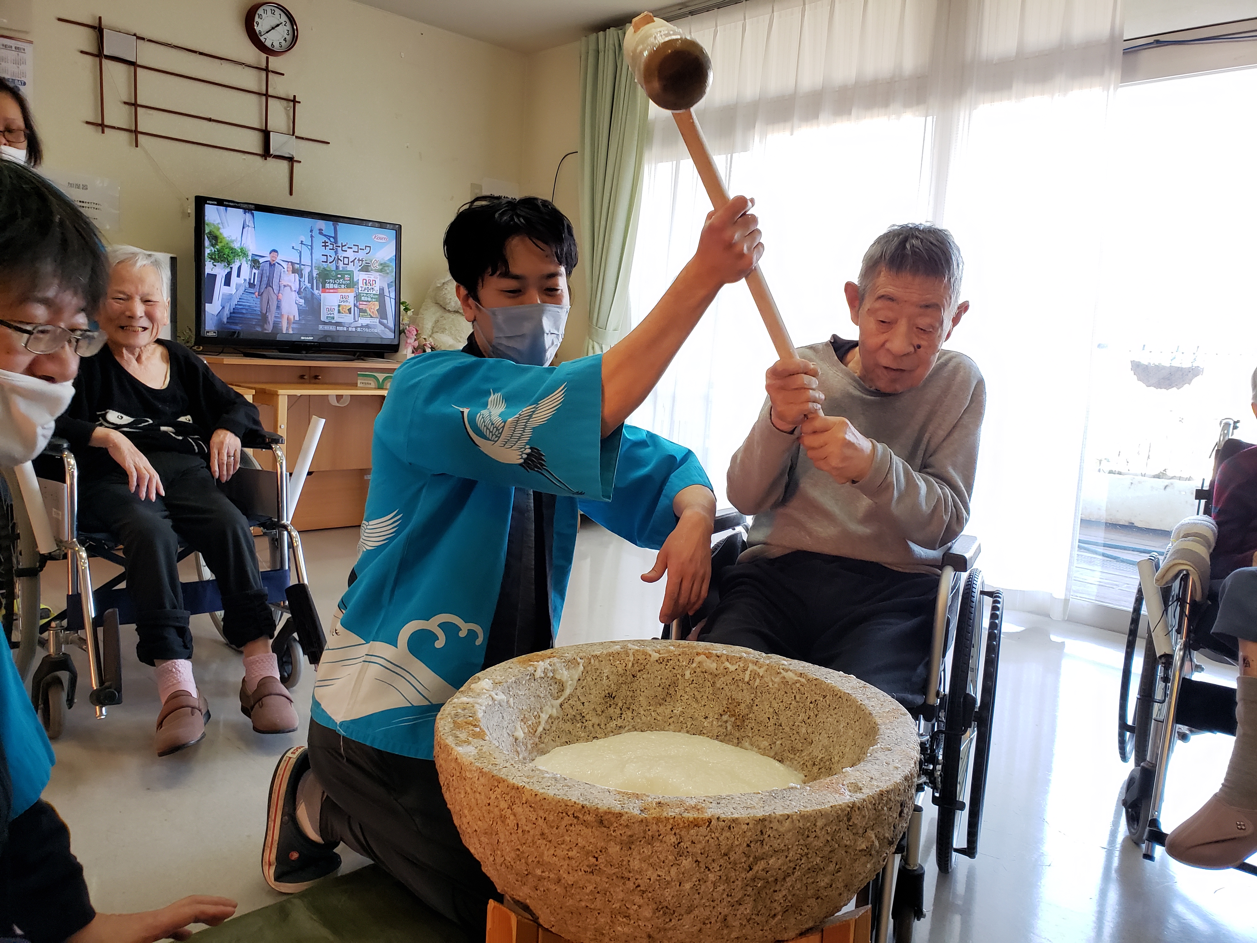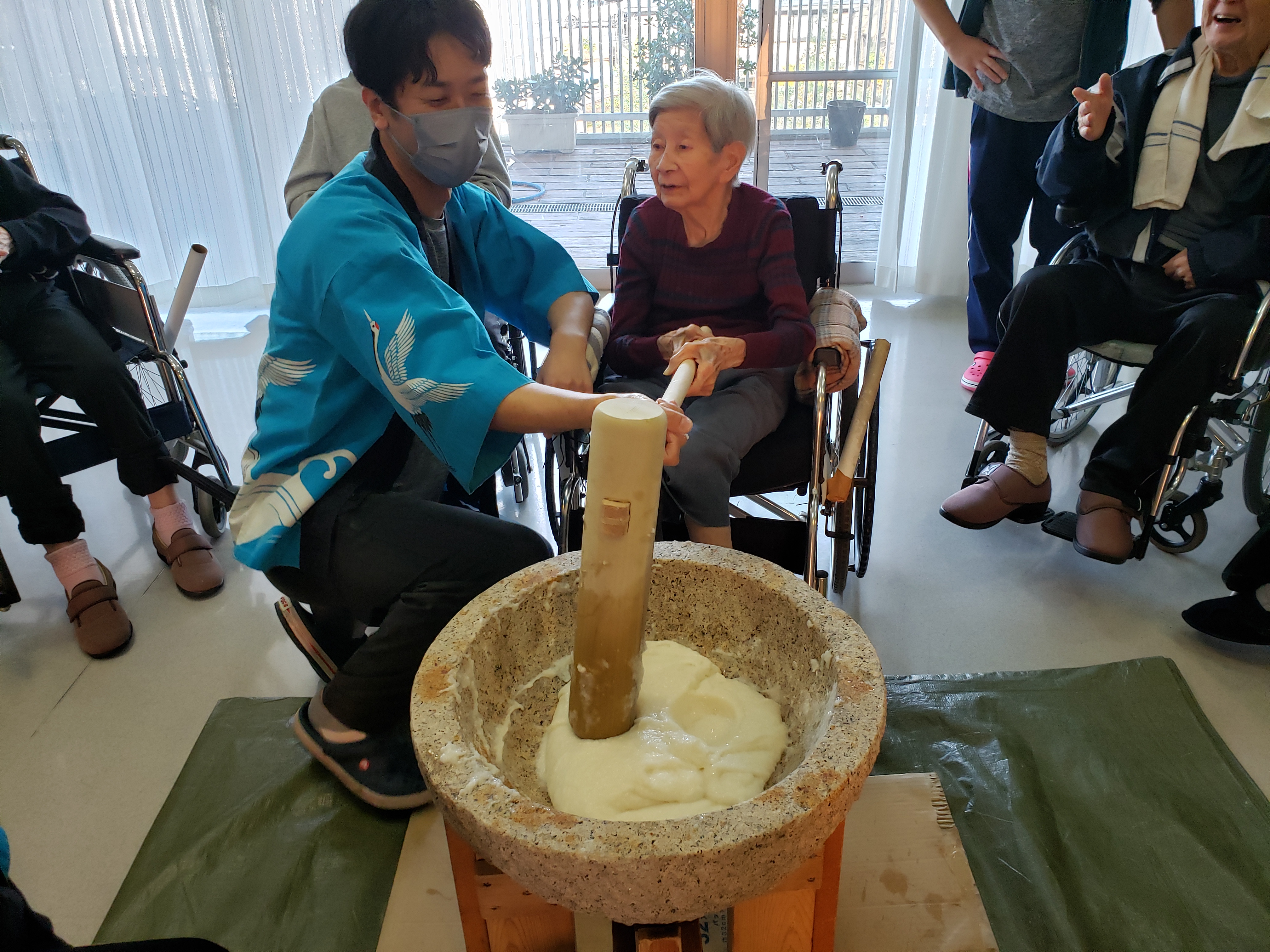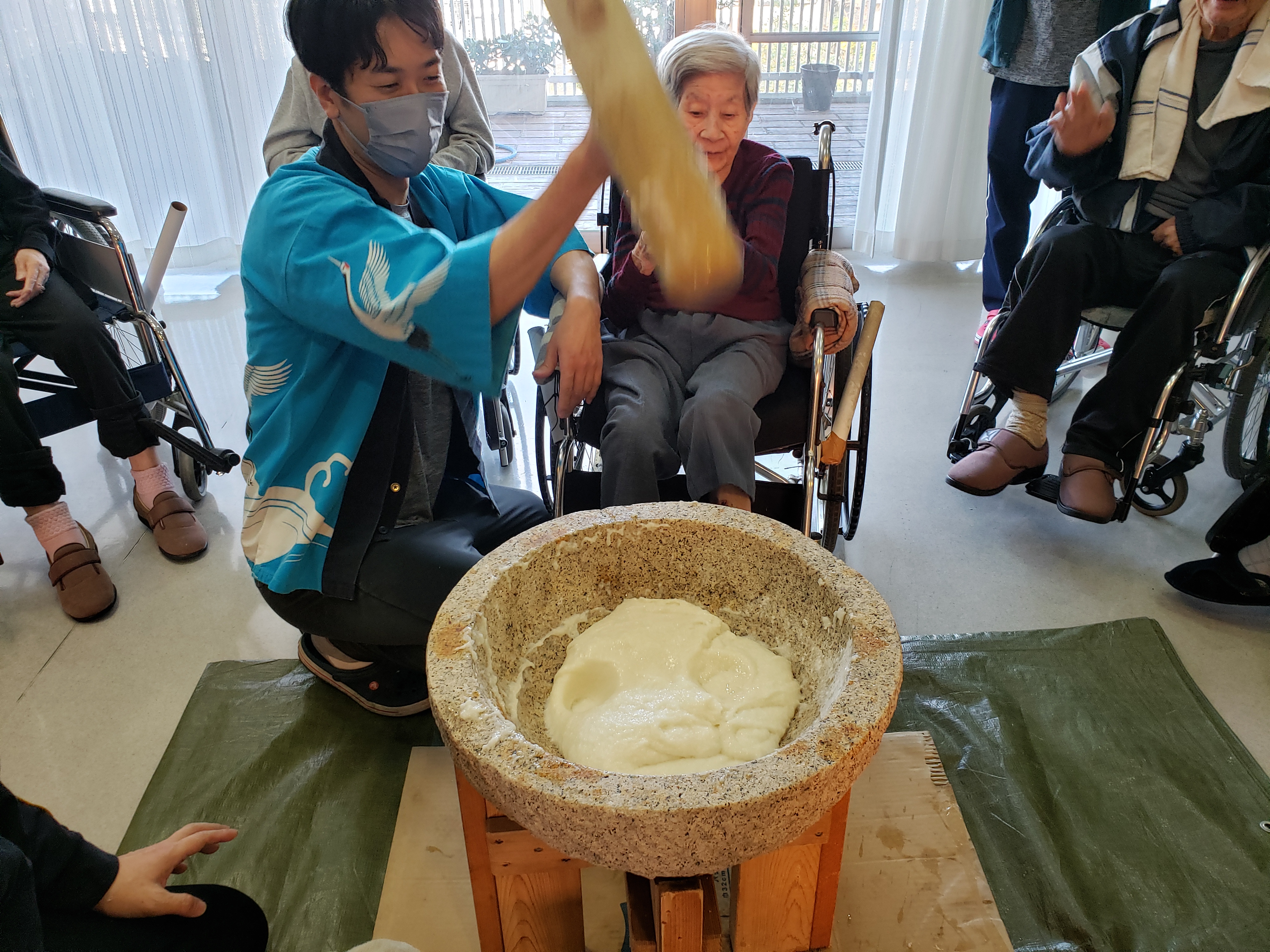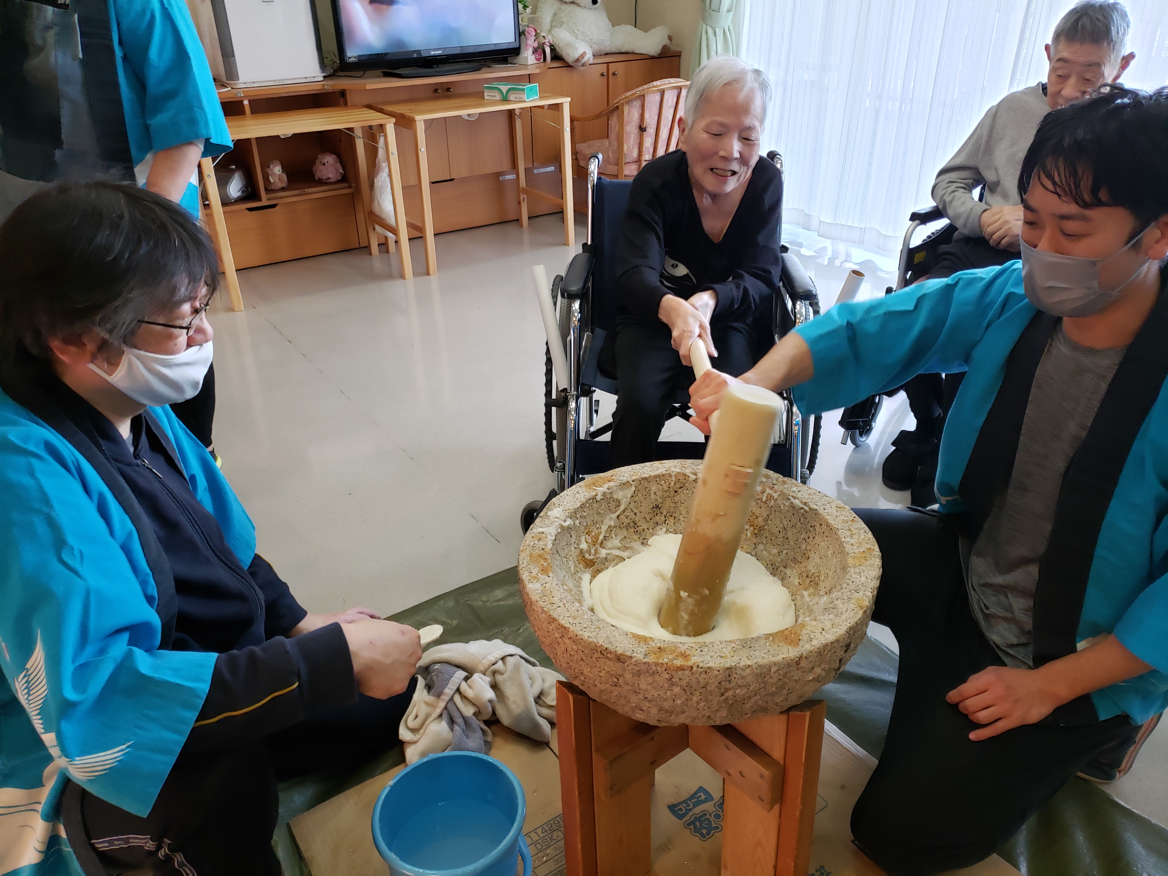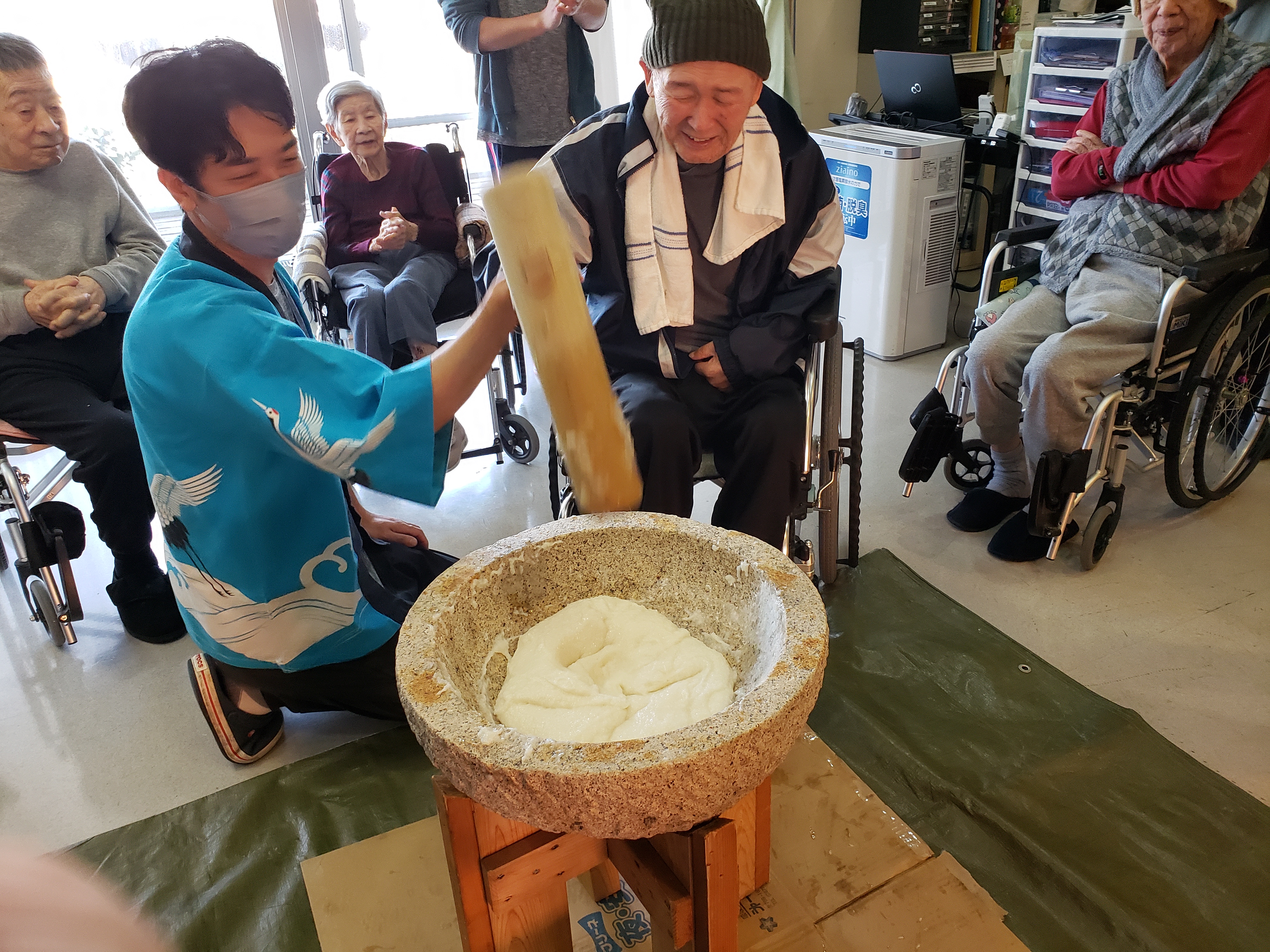 らくらく苑での餅つきは初参加のが利用者もおられましたが、皆様とても楽しく力強くついて下さいました。