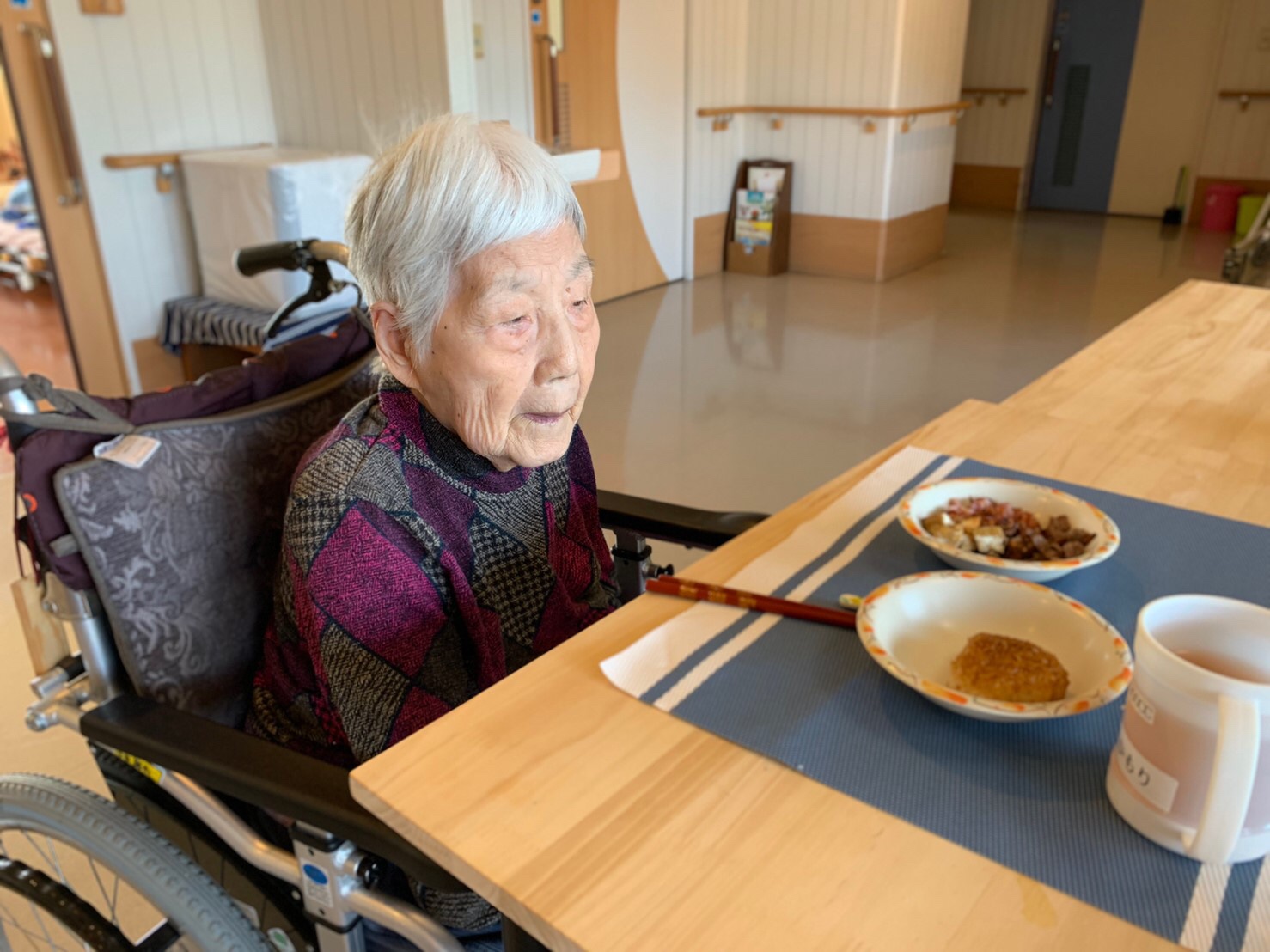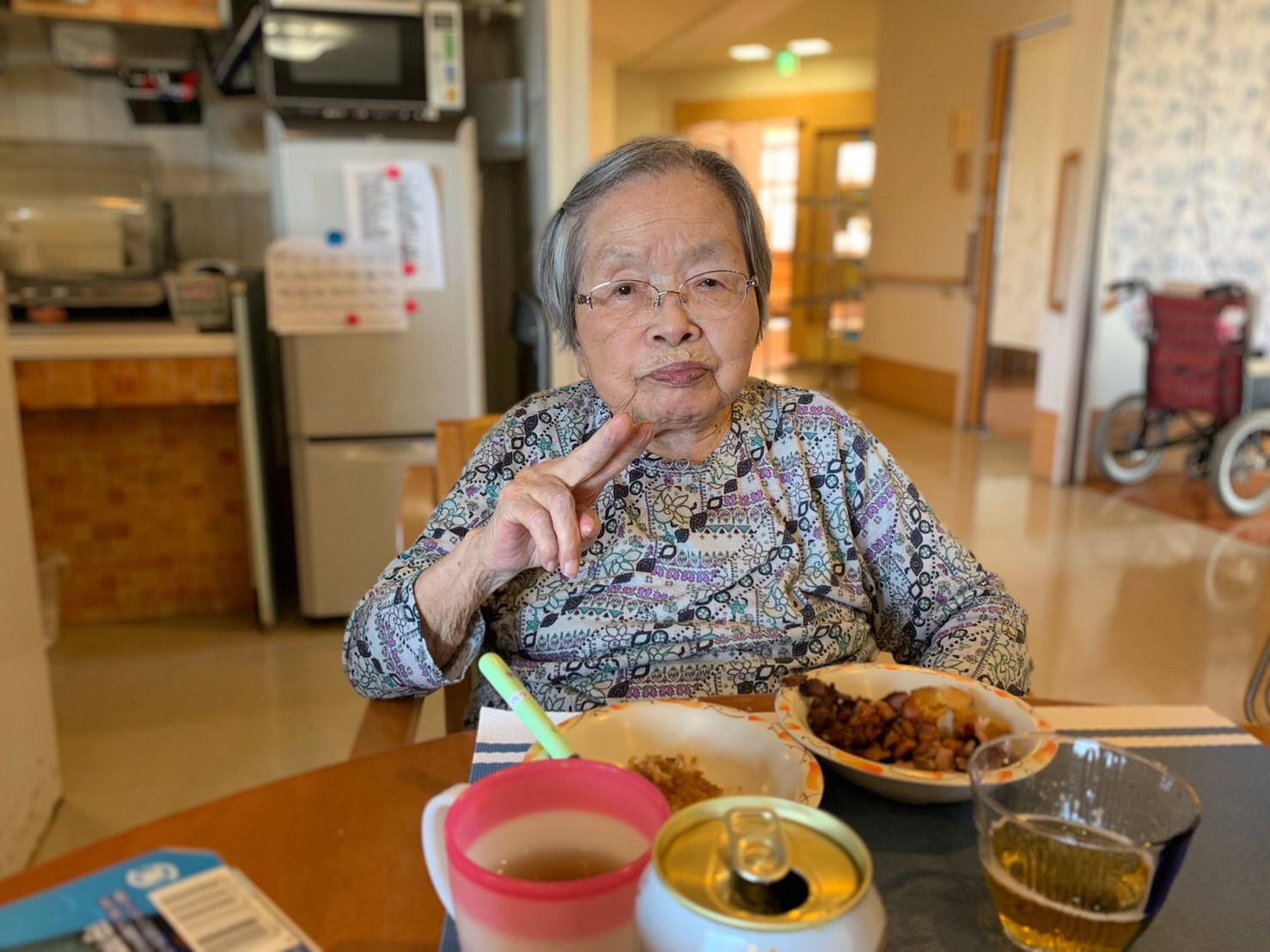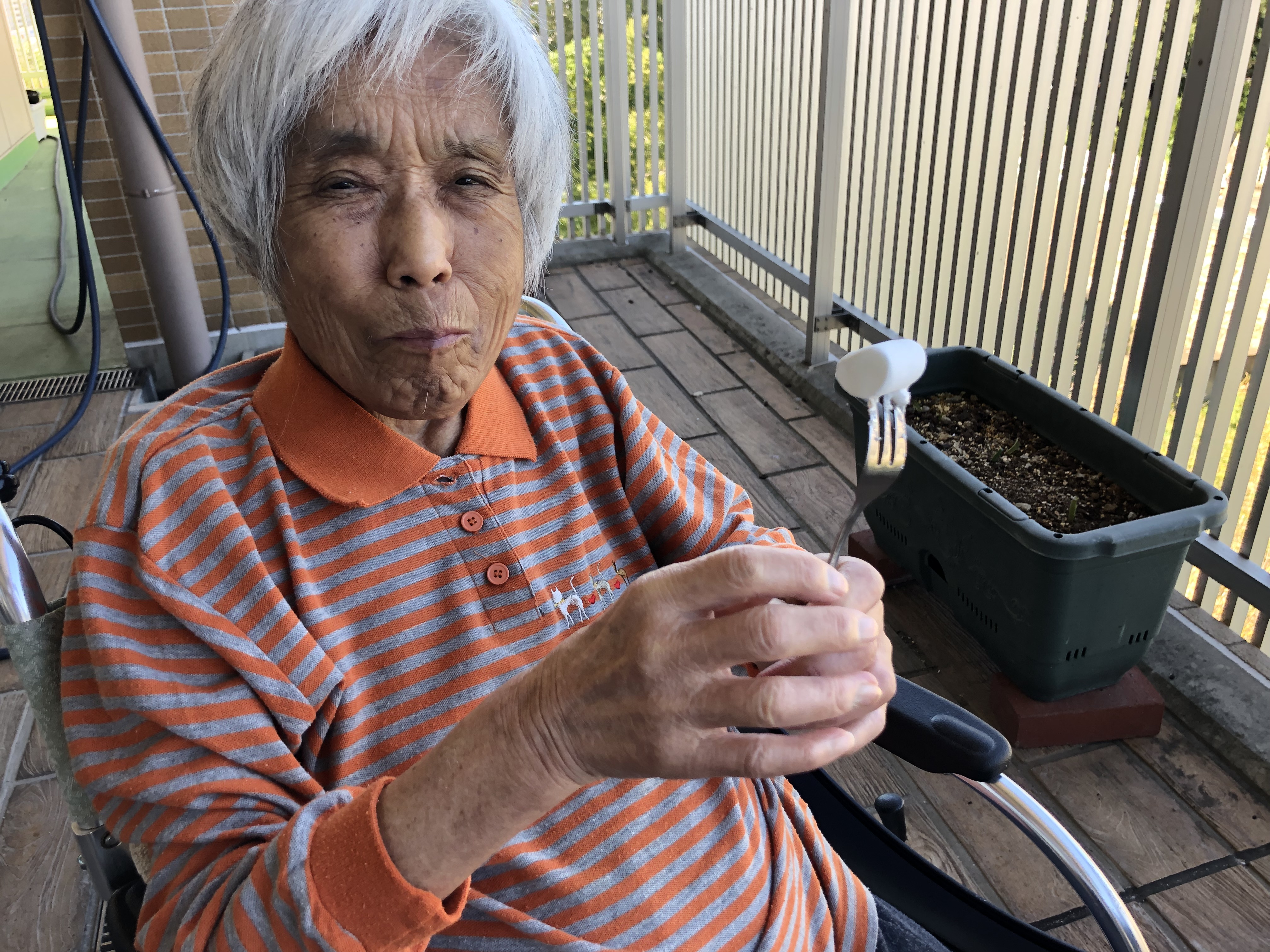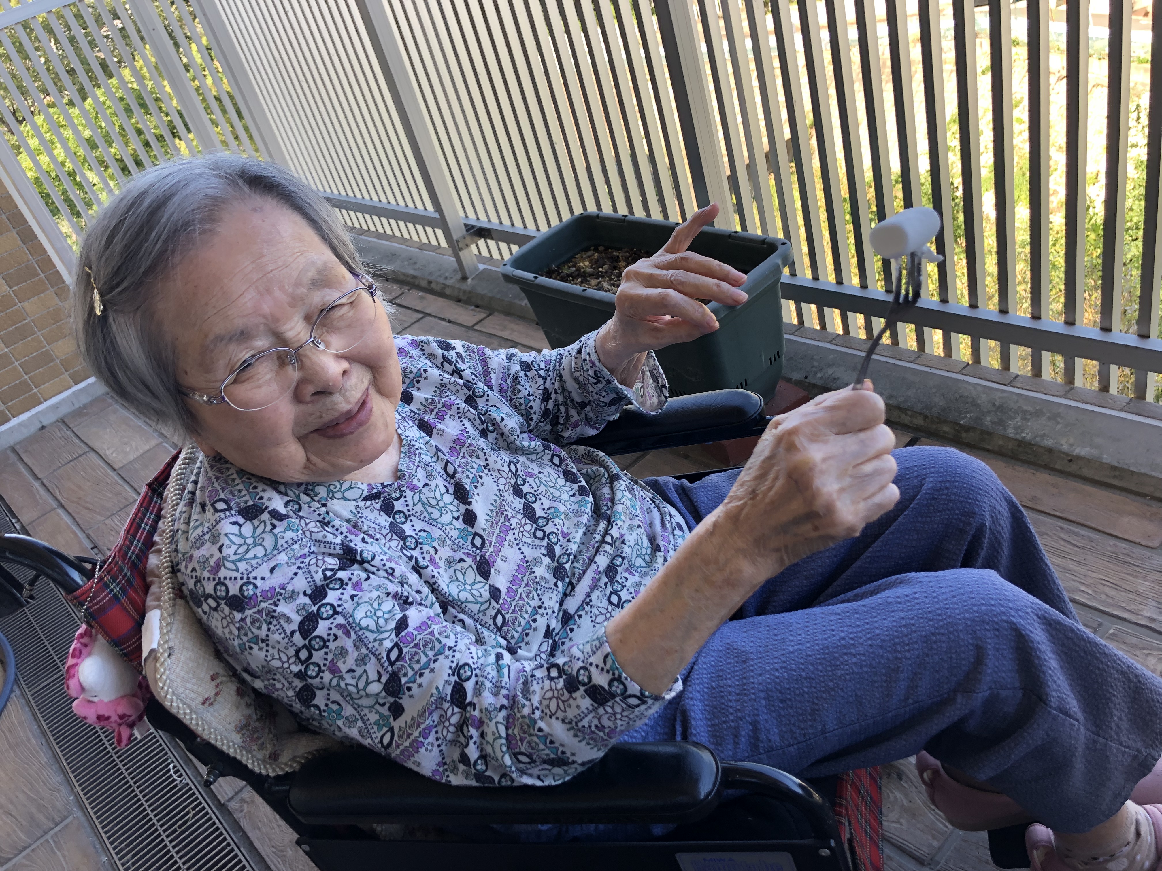 少し肌寒かったため、職員がベランダでお肉を焼き、入居者様は中で食べて頂きました。焼きたてのお肉を職員が小さくカットし、皆様美味しそうに召し上がっておられました