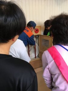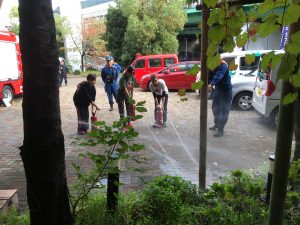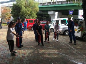 外に出て、水消火器を使って消火訓練を行いました。技能実習生の皆さんにも丁寧に説明していただきました。