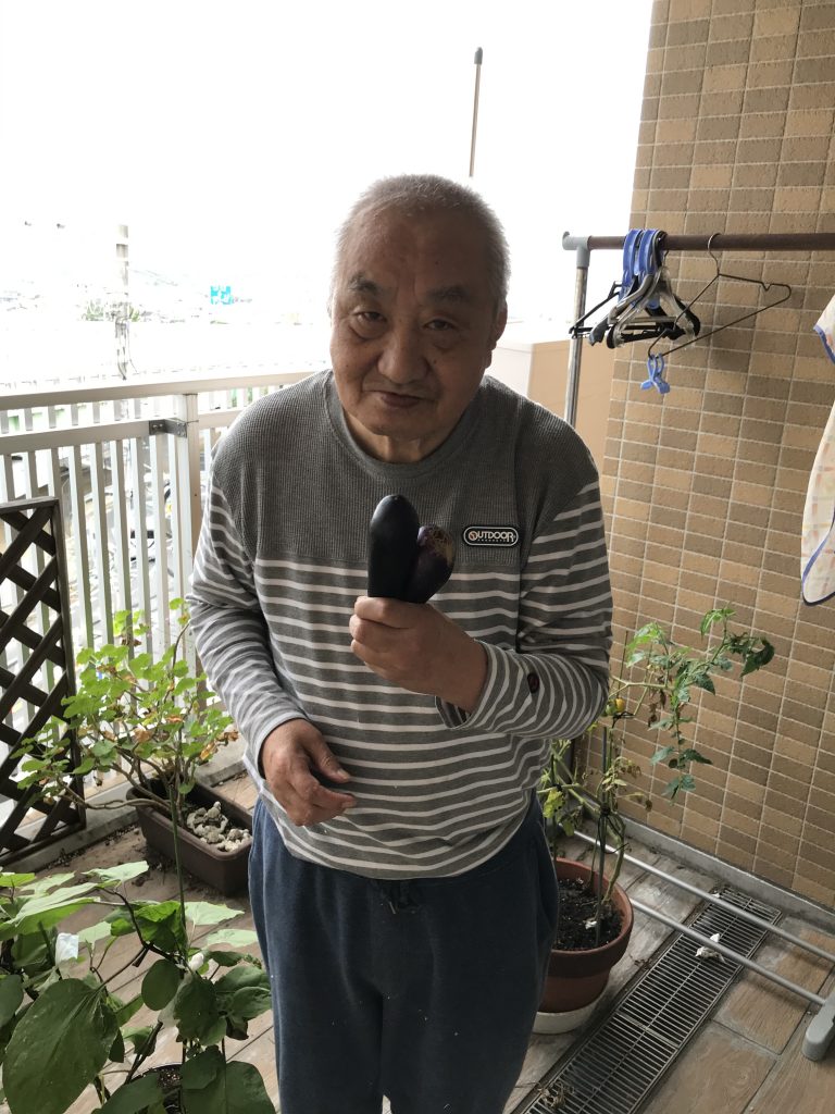 茄子の収穫をしました。水やりの甲斐があり、立派な茄子が出来ました(^^♪)後ろのトマトも色付き、食べ頃を迎えました(?)