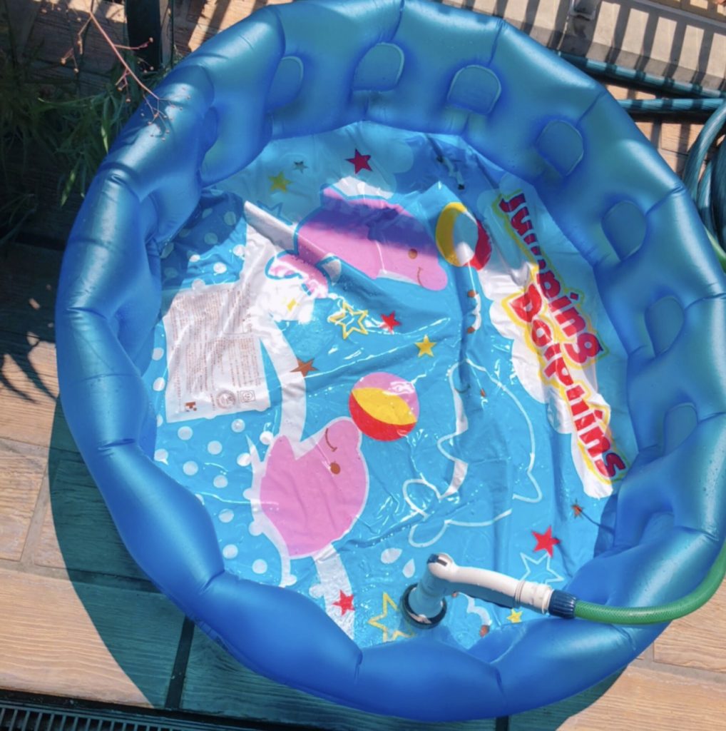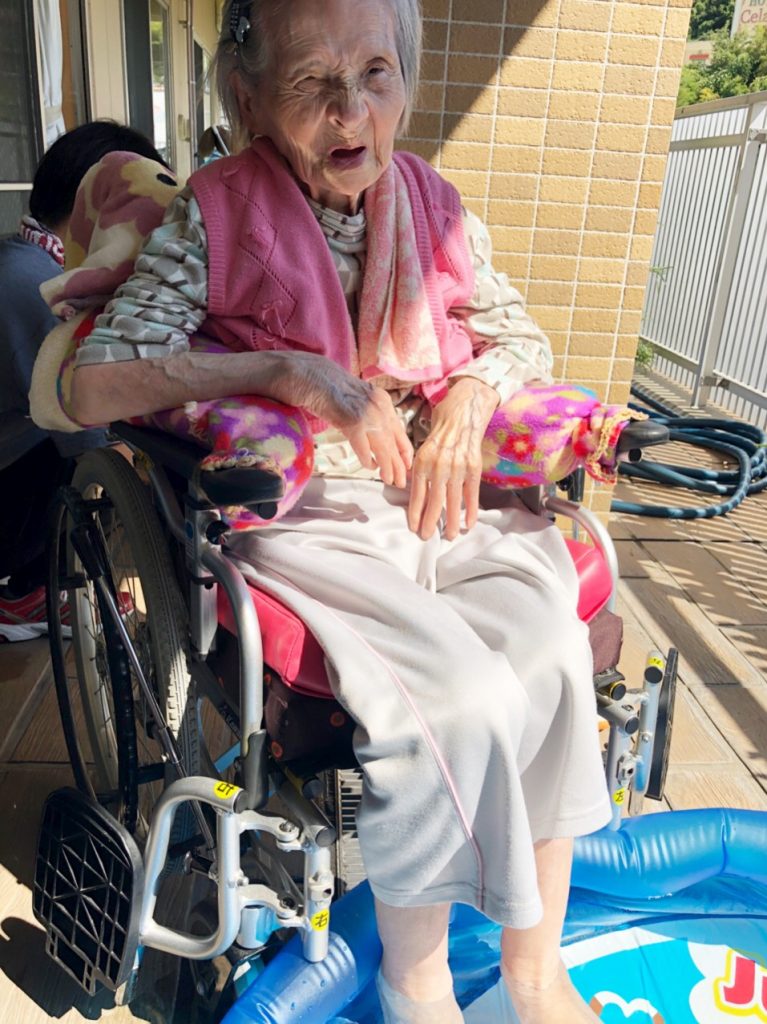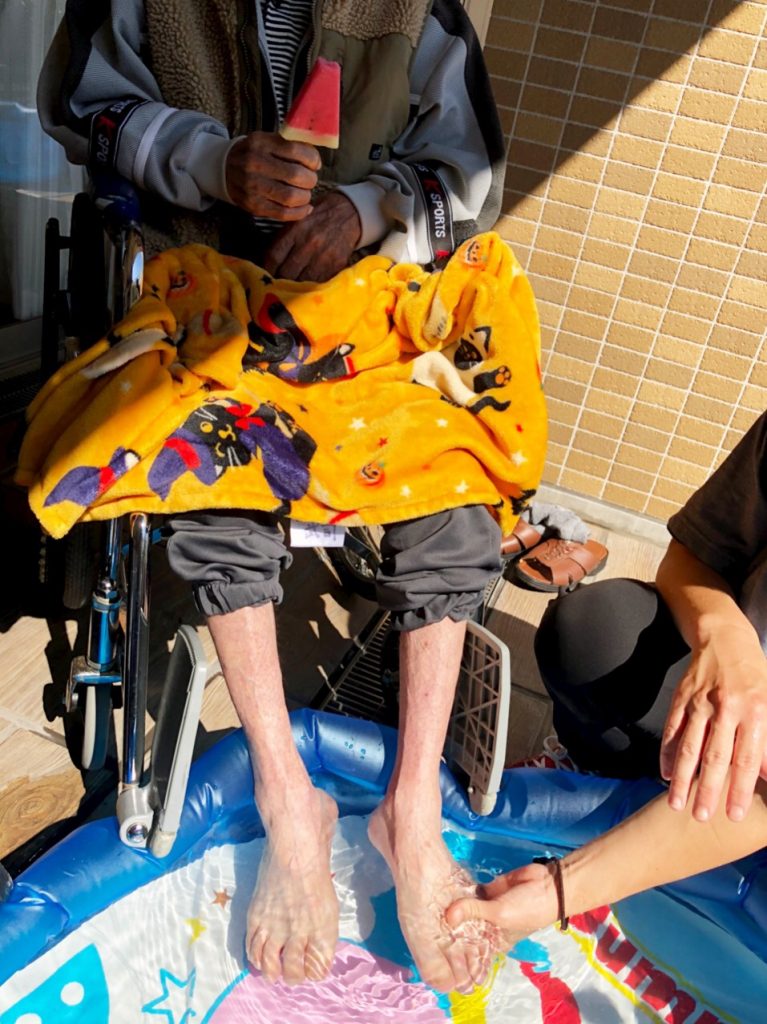 天気も良く、皆でプールで足湯をしながら冷やし飴ドリンクとスイカバーのアイスを食べました?