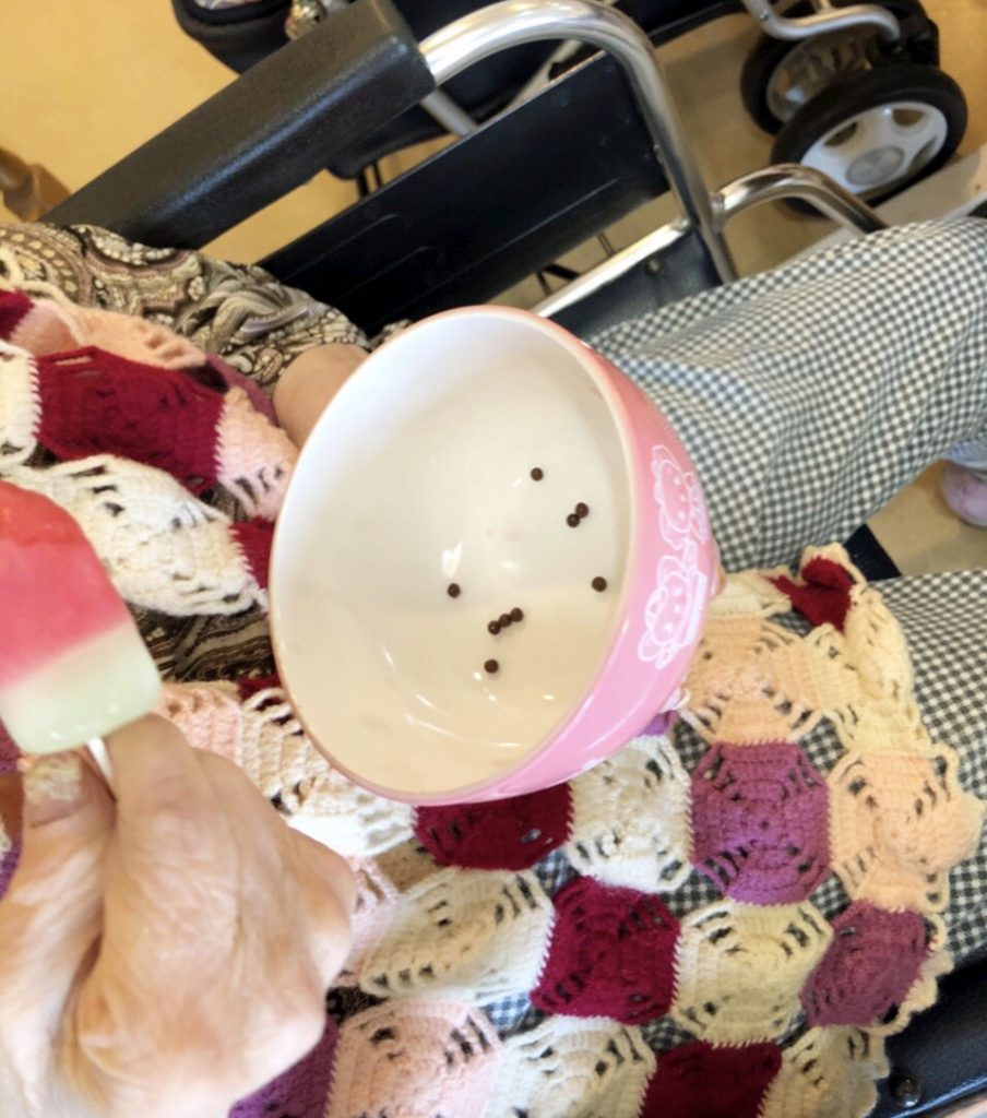 スイカバーに入っているチョコを種だと思って器用に避けて食べている方もいて、「これはチョコですよ」と言うと「ええ!」と驚かれていました(゚д゚)!笑