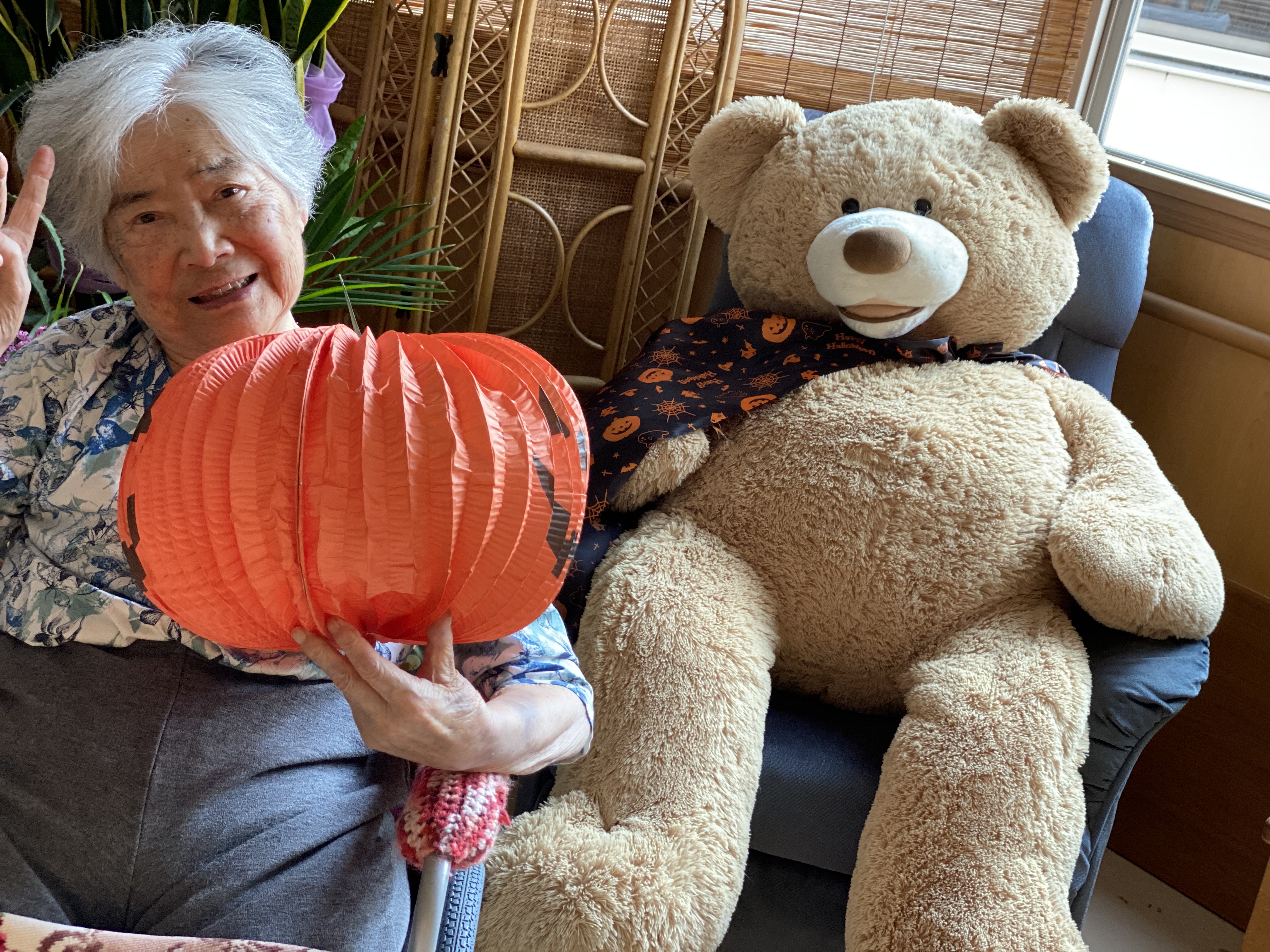 先日職員が、4階のくまのぬいぐるみにハロウィンのマントを着せていました(^_^)/