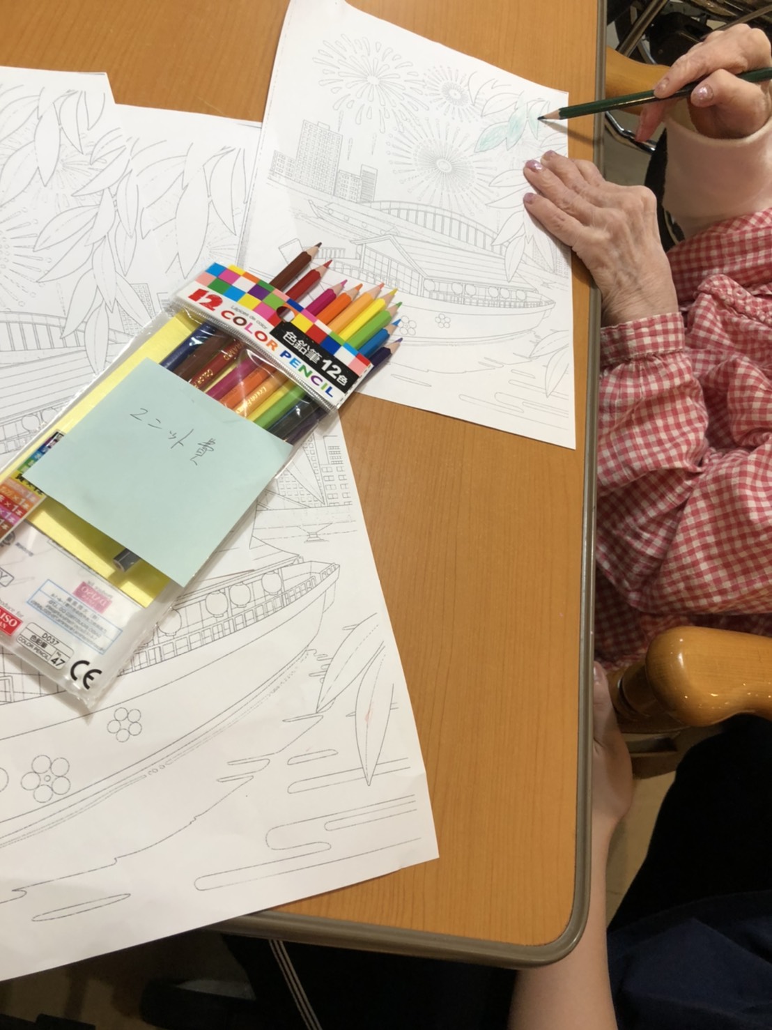 最近は塗り絵をして過ごして頂いたり、お天気の日には少し日光浴をしたり…