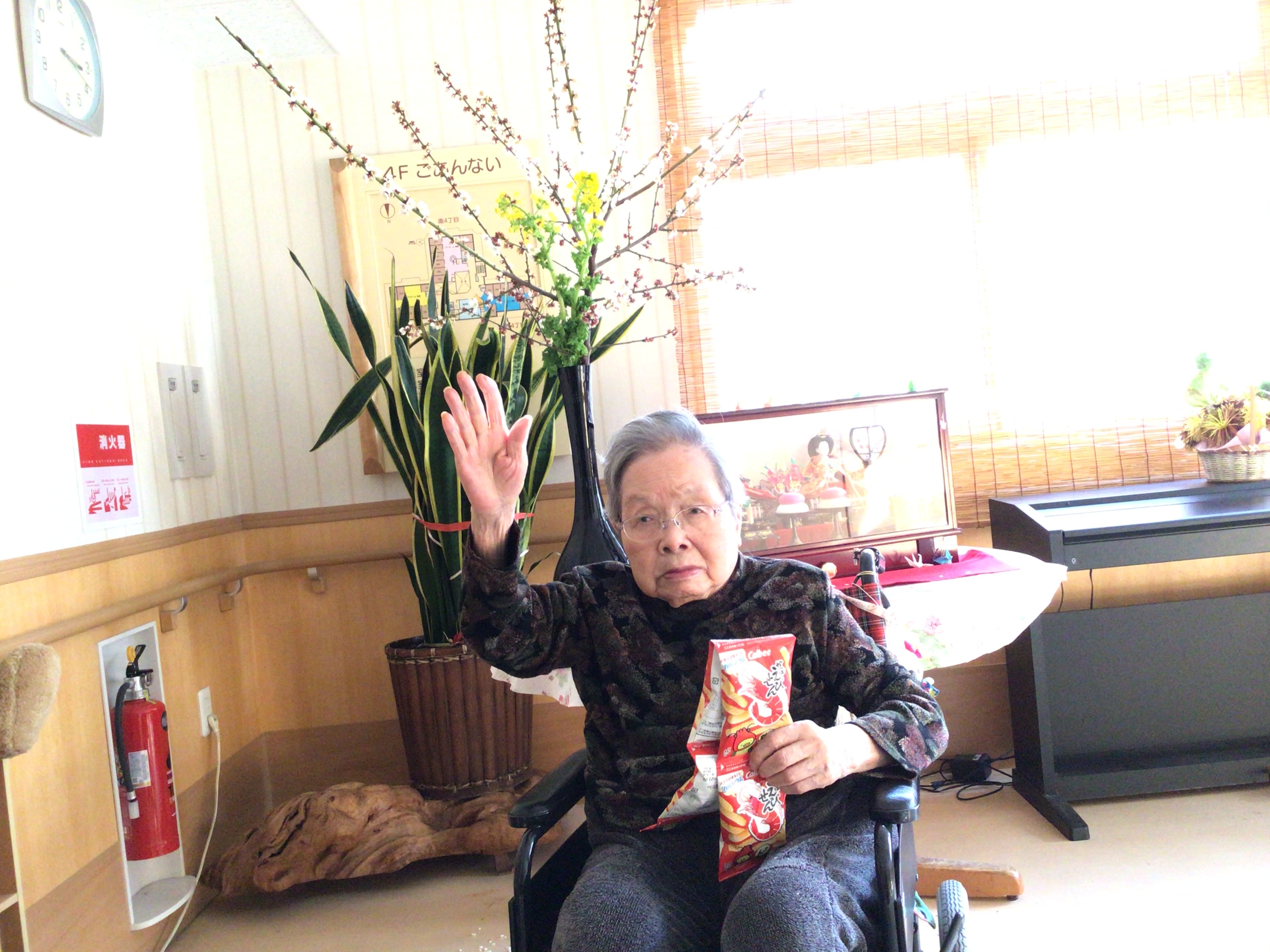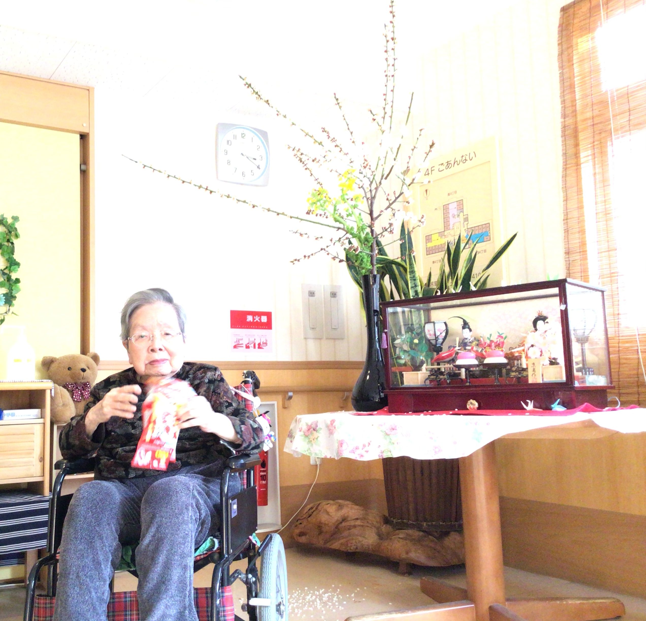 4階エレベーター前にお雛様と梅の花が飾られました(#^^#)