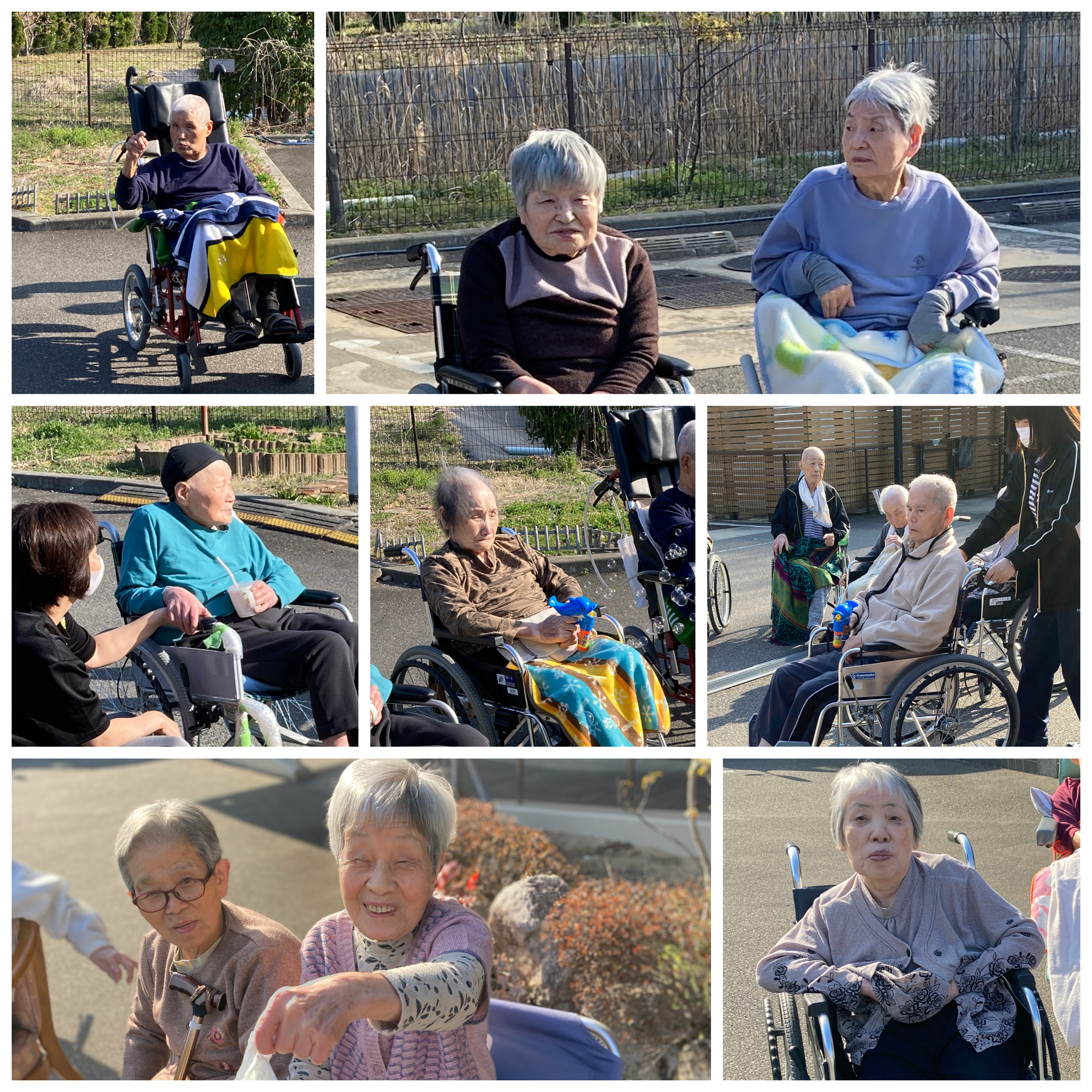 こんにちは。南野らくらく苑には広い敷地に沢山の木々やお花が植えられています。 三月の小春日和、ボールやシャボン玉を持って、皆で外へ出てみました。