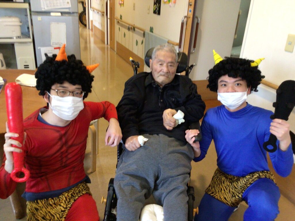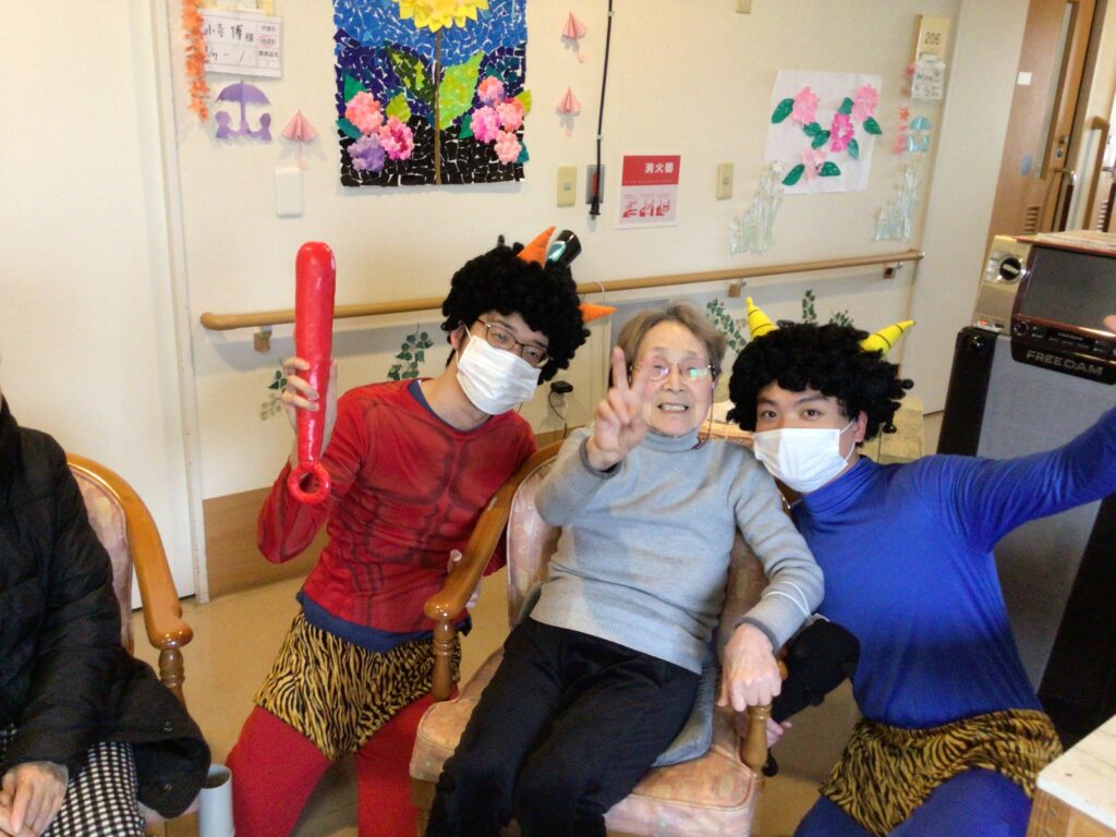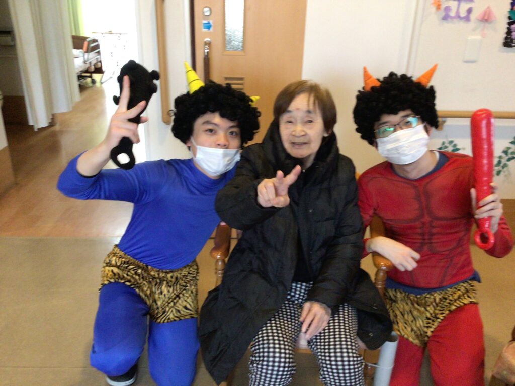 穏やかな日常に、突然鬼が現れました。 ご利用者と、職員が力を合わせて退治しました。 すると、鬼さんと仲良くなりました。 節分行事の話です。